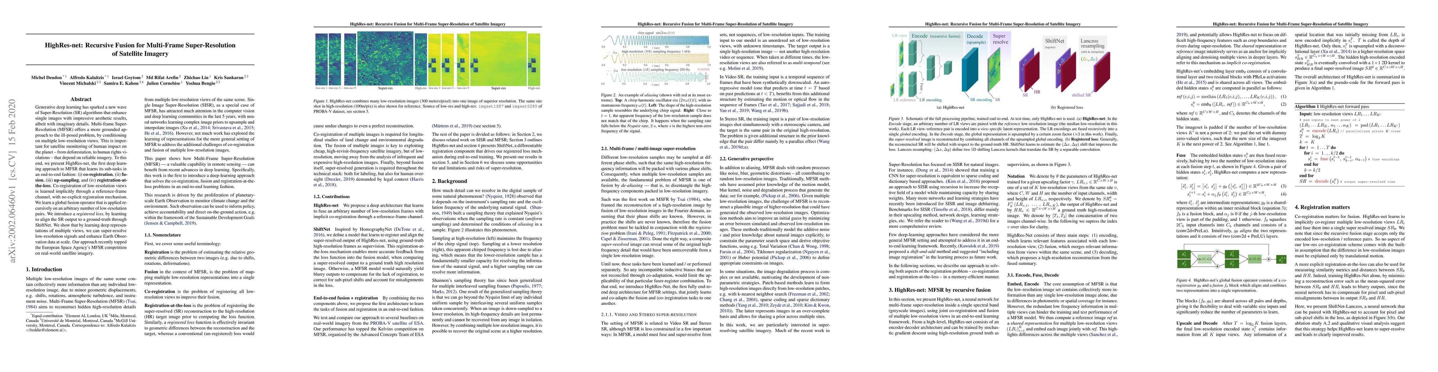 HighRes-net presents a novel deep learning approach for Multi-Frame Super-Resolution (MFSR) of satellite imagery, achieving end-to-end learning of co-registration, fusion, up-sampling, and registration-at-the-loss, and recently winning the European Space Agency's MFSR competition.