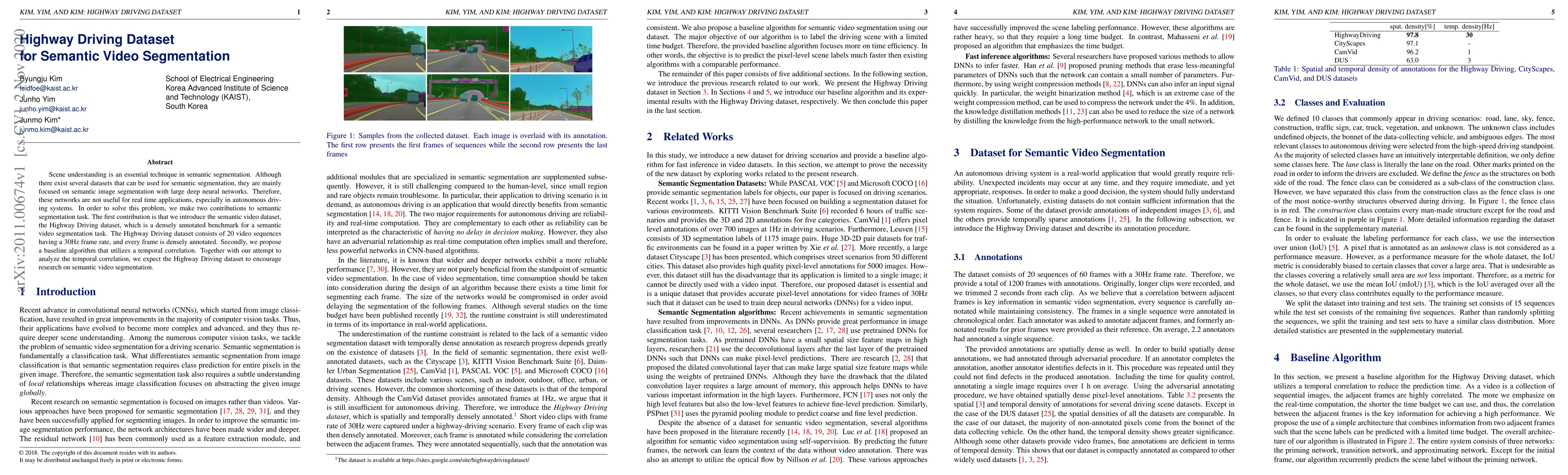 Scene understanding is an essential technique in semantic segmentation. Although there exist several datasets that can be used for semantic segmentation, they are mainly focused on semantic image segmentation with large deep neural networks. Therefore, these networks are not useful for real time applications, especially in autonomous driving systems. In order to solve this problem, we make two contributions to semantic segmentation task. The first contribution is that we introduce the semantic video dataset, the Highway Driving dataset, which is a densely annotated benchmark for a semantic video segmentation task. The Highway Driving dataset consists of 20 video sequences having a 30Hz frame rate, and every frame is densely annotated. Secondly, we propose a baseline algorithm that utilizes a temporal correlation. Together with our attempt to analyze the temporal correlation, we expect the Highway Driving dataset to encourage research on semantic video segmentation.