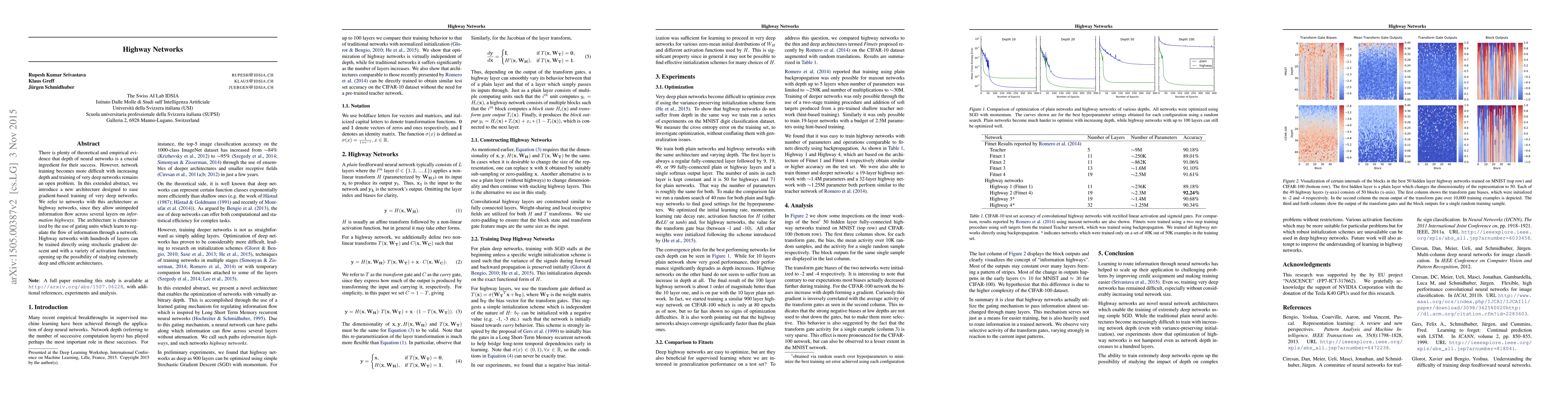 This paper introduces highway networks, a new deep neural network architecture that facilitates the training of very deep networks by using gating units to regulate information flow. These networks can be trained directly with stochastic gradient descent, enabling the study of extremely deep and efficient architectures.