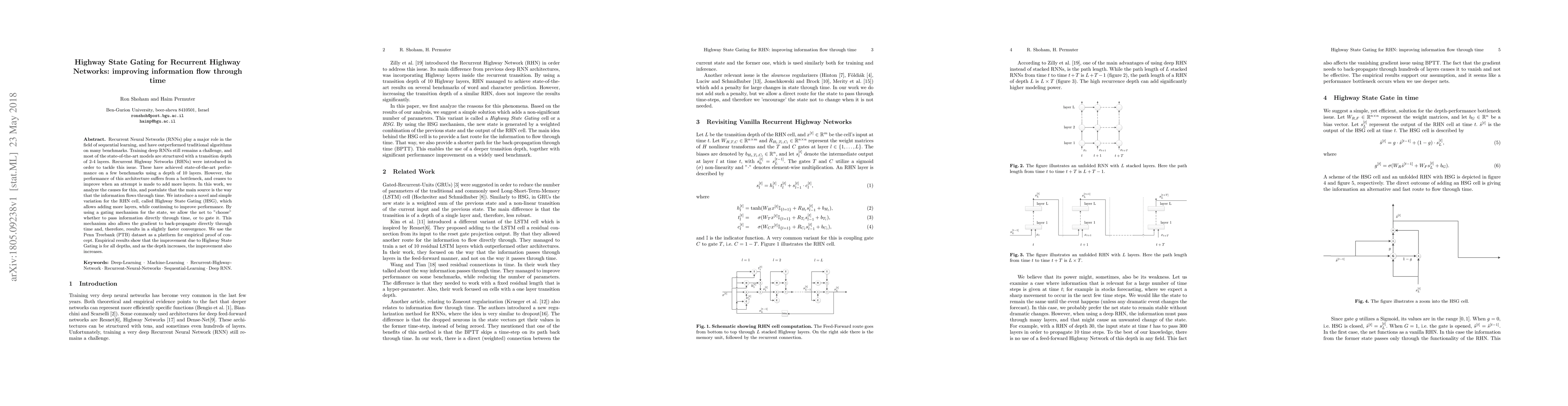 This paper proposes Highway State Gating (HSG) to improve the performance of Recurrent Highway Networks (RHNs) by enhancing information flow through time. The HSG mechanism allows the network to selectively pass information directly or gate it, facilitating better gradient backpropagation and faster convergence, demonstrated effectively on the Penn Treebank dataset.