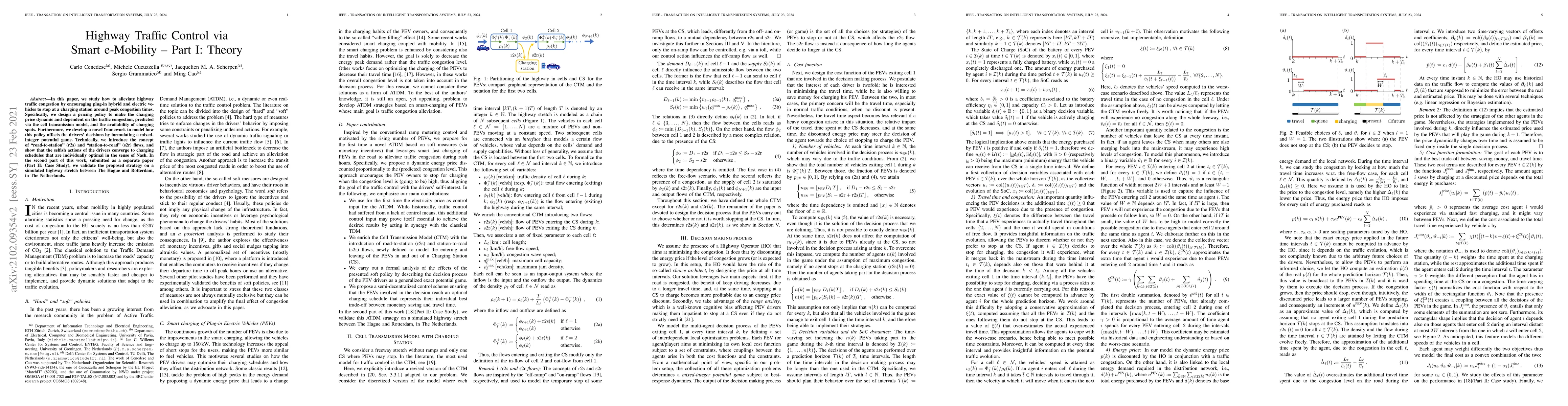 In this paper, we study how to alleviate highway traffic congestion by encouraging plug-in hybrid and electric vehicles to stop at a charging station around peak congestion times. Specifically, we design a pricing policy to make the charging price dynamic and dependent on the traffic congestion, predicted via the cell transmission model, and the availability of charging spots. Furthermore, we develop a novel framework to model how this policy affects the drivers' decisions by formulating a mixed-integer potential game. Technically, we introduce the concept of "road-to-station" (r2s) and "station-to-road" (s2r) flows, and show that the selfish actions of the drivers converge to charging schedules that are individually optimal in the sense of Nash. In the second part of this work, submitted as a separate paper (Part II: Case Study), we validate the proposed strategy on a simulated highway stretch between The Hague and Rotterdam, in The Netherlands.