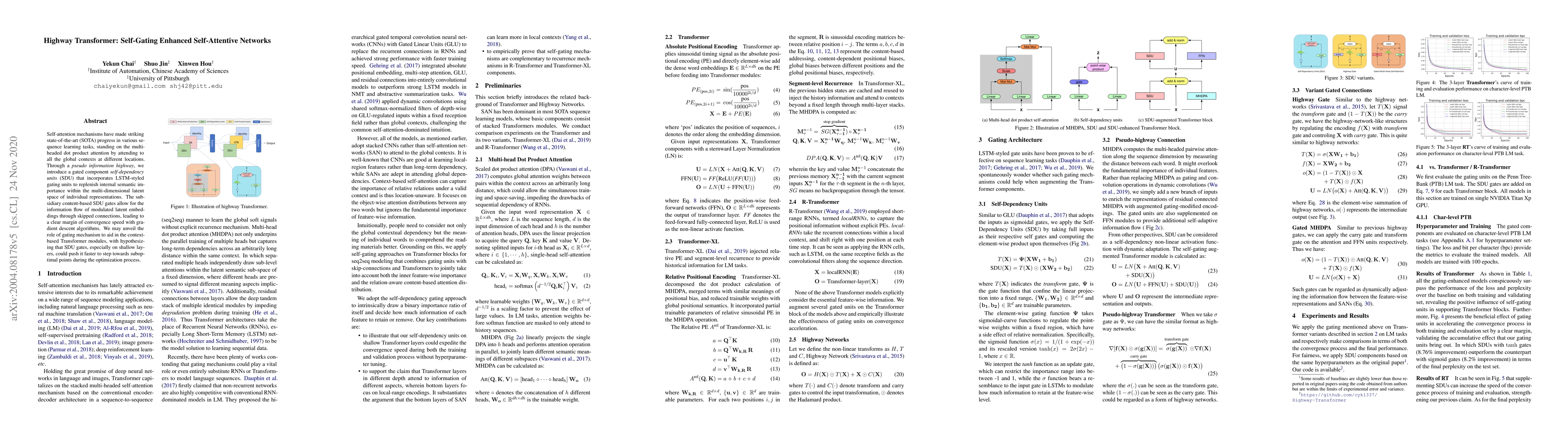 The Highway Transformer introduces self-gating self-dependency units to enhance self-attention networks, using LSTM-styled gating to improve information flow and speed up convergence. The gating mechanism is hypothesized to help shallow layers reach suboptimal points faster during optimization.