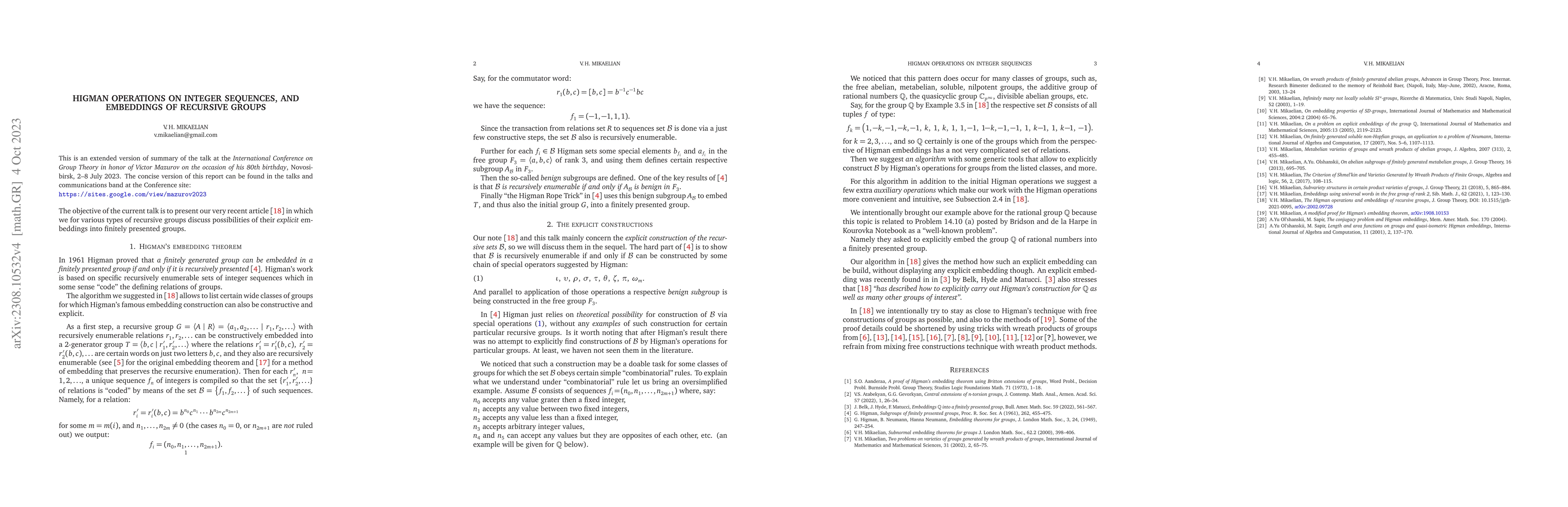Summary: This paper explores the embedding of recursive groups into finitely presented groups, focusing on Higman operations on integer sequences. It discusses recent findings on the explicit embedding possibilities for various recursive groups.
