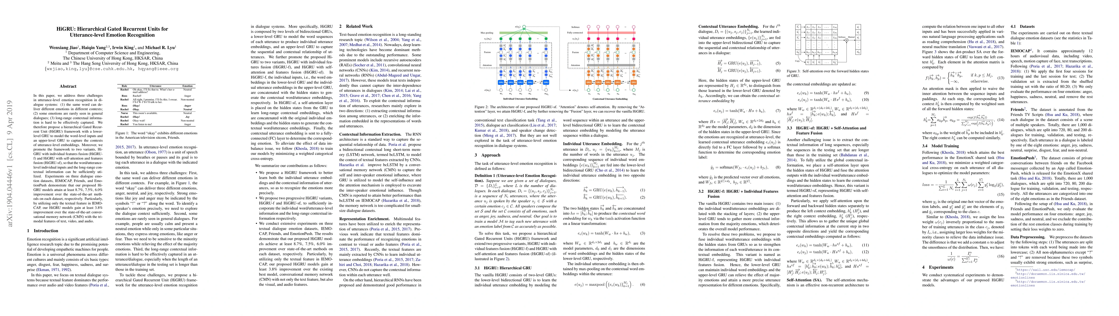The paper proposes a hierarchical Gated Recurrent Unit (HiGRU) framework for utterance-level emotion recognition in dialogue systems, addressing challenges like context-dependent word emotions, rare emotions, and long-range context capture. The HiGRU model, with its lower-level GRU for word inputs and upper-level GRU for utterance contexts, achieves significant improvements over state-of-the-art methods on three datasets.