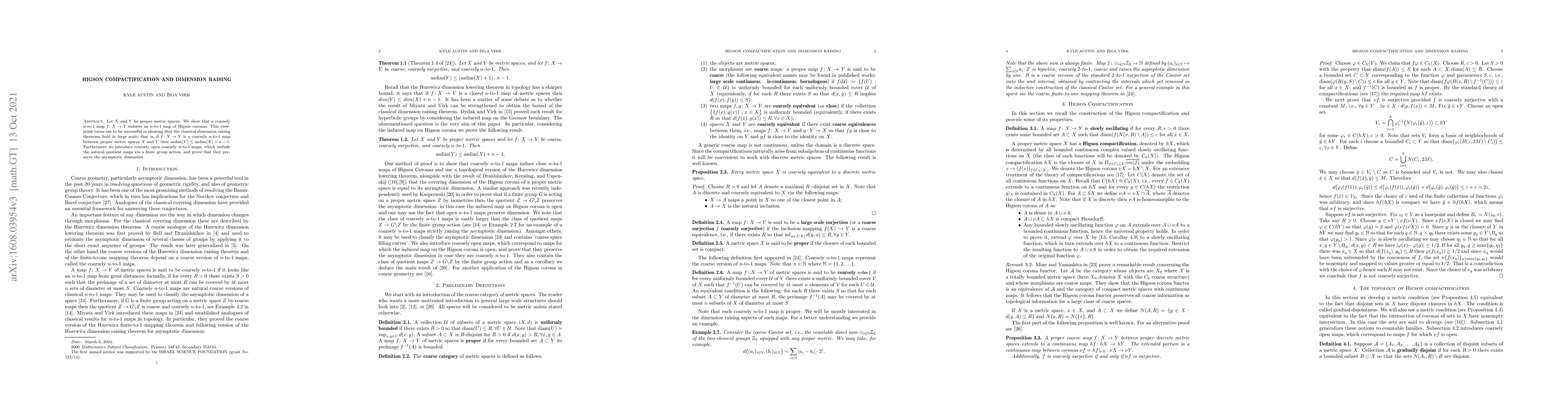 Let $X$ and $Y$ be proper metric spaces. We show that a coarsely $n$-to-$1$ map $f\colon X\to Y$ induces an $n$-to-$1$ map of Higson coronas. This viewpoint turns out to be successful in showing that the classical dimension raising theorems hold in large scale; that is, if $f \colon X\to Y$ is a coarsely $n$-to-$1$ map between proper metric spaces $X$ and $Y$ then $asdim(Y) \leq asdim(X) + n -1$. Furthermore we introduce coarsely open coarsely $n$-to-$1$ maps, which include the natural quotient maps via a finite group action, and prove that they preserve the asymptotic dimension.