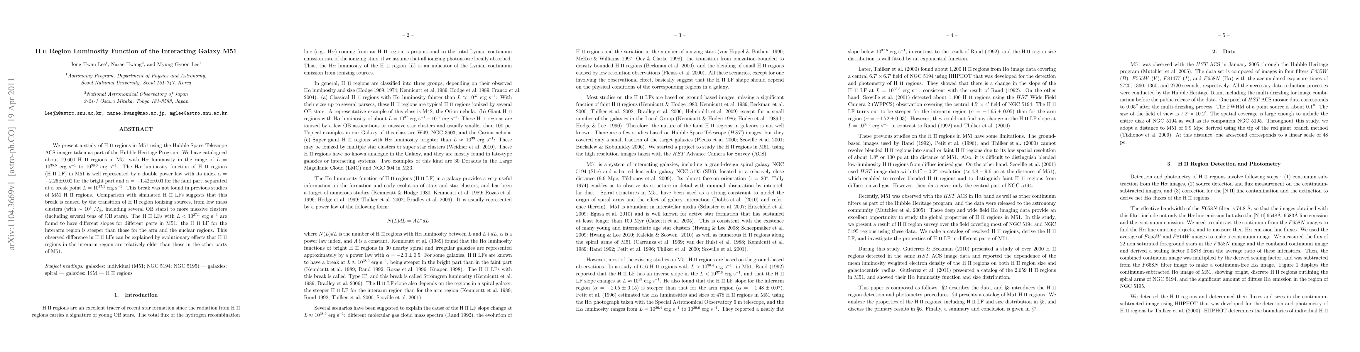 We present a study of HII regions in M51 using the Hubble Space Telescope ACS images taken as part of the Hubble Heritage Program. We have catalogued about 19,600 HII regions in M51 with Ha luminosity in the range of L = 10^{35.5} erg/s to 10^{39.0} erg/s. The Ha luminosity function of HII regions (HII LF) in M51 is well represented by a double power law with its index alpha=-2.25\pm0.02 for the bright part and alpha=-1.42\pm0.01 for the faint part, separated at a break point L= 10^{37.1} erg/s. This break was not found in previous studies of M51 HII regions. Comparison with simulated HII LFs suggests that this break is caused by the transition of HII region ionizing sources, from low mass clusters (with ~ 10^3 M_sun, including several OB stars) to more massive clusters (including several tens of OB stars). The HII LFs with L < 10^{37.1} erg/s are found to have different slopes for different parts in M51: the HII LF for the interarm region is steeper than those for the arm and the nuclear regions. This observed difference in HII LFs can be explained by evolutionary effects that HII regions in the interarm region are relatively older than those in the other parts of M51.