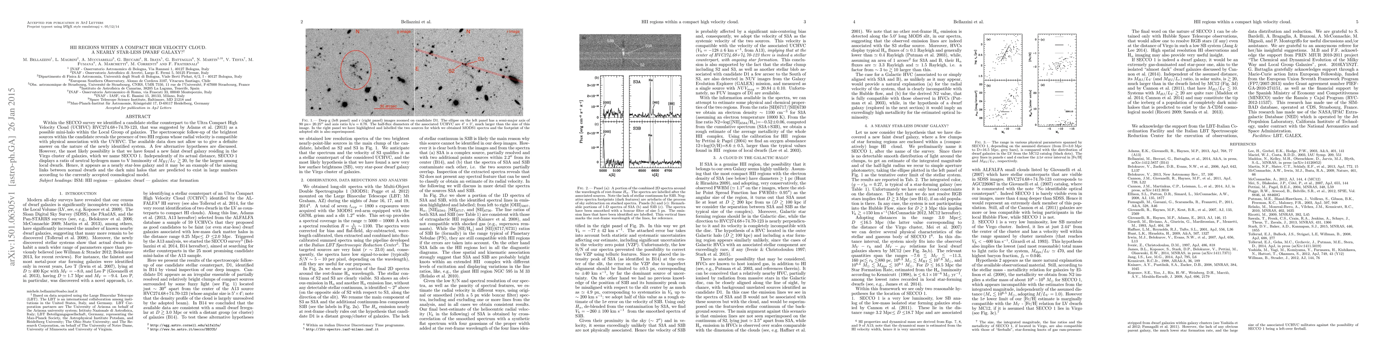 Within the SECCO survey we identified a candidate stellar counterpart to the Ultra Compact High Velocity Cloud (UCHVC) HVC274.68+74.70-123, that was suggested by Adams et al. (2013) as a possible mini-halo within the Local Group of galaxies. The spectroscopic follow-up of the brightest sources within the candidate reveals the presence of two HII regions whose radial velocity is compatible with physical association with the UVHVC. The available data does not allow us to give a definite answer on the nature of the newly identified system. A few alternative hypotheses are discussed. However, the most likely possibility is that we have found a new faint dwarf galaxy residing in the Virgo cluster of galaxies, which we name SECCO-1. Independently of its actual distance, SECCO-1 displays a ratio of neutral hydrogen mass to V luminosity of M_{HI}/L_V>= 20, by far the largest among local dwarfs. Hence, it appears as a nearly star-less galaxy and it may be an example of the missing links between normal dwarfs and the dark mini halos that are predicted to exist in large numbers according to the currently accepted cosmological model.