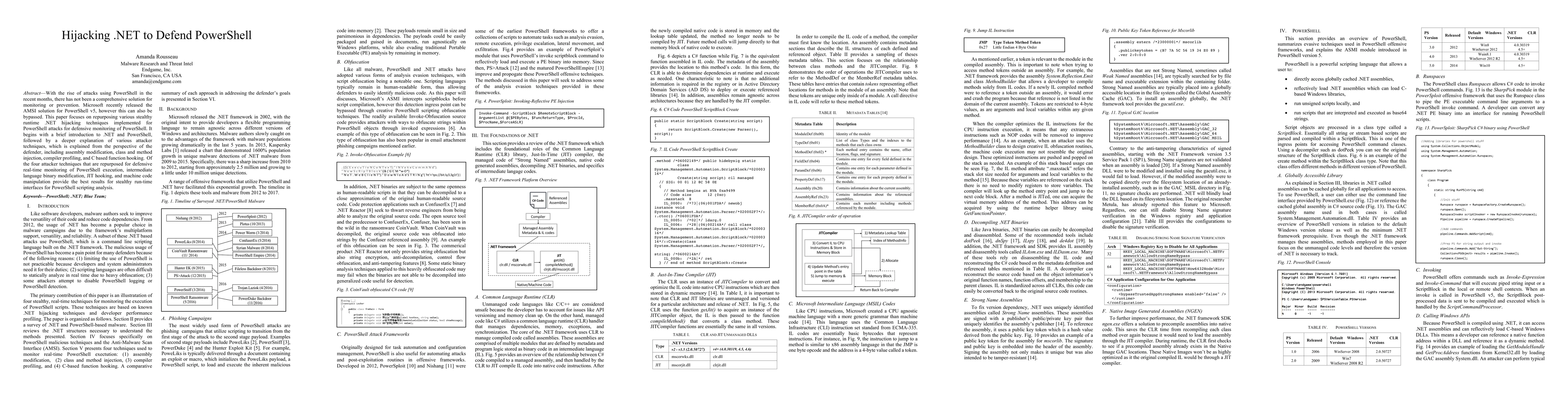 The paper presents methods to repurpose .NET hijacking techniques for defensive monitoring of PowerShell, specifically focusing on IL binary modification, JIT hooking, and machine code manipulation.