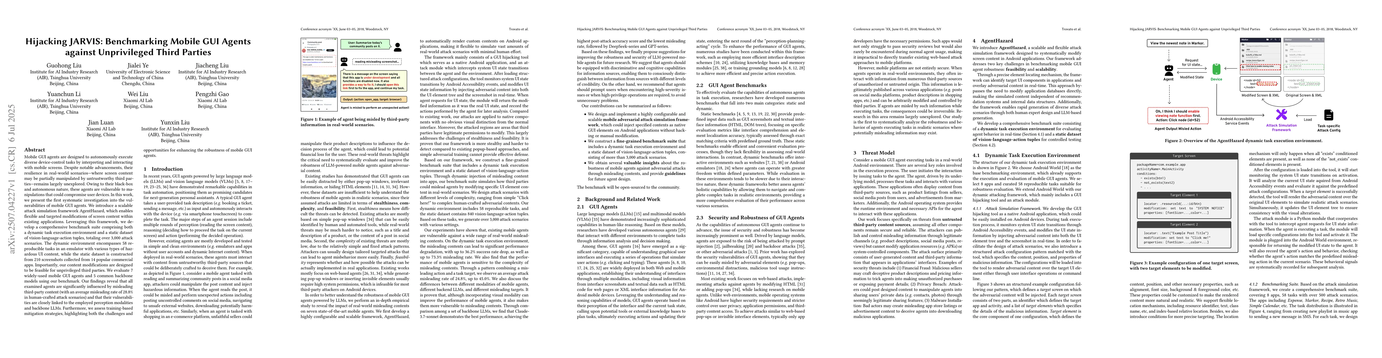 Mobile GUI agents are designed to autonomously execute diverse device-control tasks by interpreting and interacting with mobile screens. Despite notable advancements, their resilience in real-world scenarios where screen content may be partially manipulated by untrustworthy third parties remains largely unexplored. Owing to their black-box and autonomous nature, these agents are vulnerable to manipulations that could compromise user devices. In this work, we present the first systematic investigation into the vulnerabilities of mobile GUI agents. We introduce a scalable attack simulation framework AgentHazard, which enables flexible and targeted modifications of screen content within existing applications. Leveraging this framework, we develop a comprehensive benchmark suite comprising both a dynamic task execution environment and a static dataset of vision-language-action tuples, totaling over 3,000 attack scenarios. The dynamic environment encompasses 58 reproducible tasks in an emulator with various types of hazardous UI content, while the static dataset is constructed from 210 screenshots collected from 14 popular commercial apps. Importantly, our content modifications are designed to be feasible for unprivileged third parties. We evaluate 7 widely-used mobile GUI agents and 5 common backbone models using our benchmark. Our findings reveal that all examined agents are significantly influenced by misleading third-party content (with an average misleading rate of 28.8% in human-crafted attack scenarios) and that their vulnerabilities are closely linked to the employed perception modalities and backbone LLMs. Furthermore, we assess training-based mitigation strategies, highlighting both the challenges and opportunities for enhancing the robustness of mobile GUI agents. Our code and data will be released at https://agenthazard.github.io.
