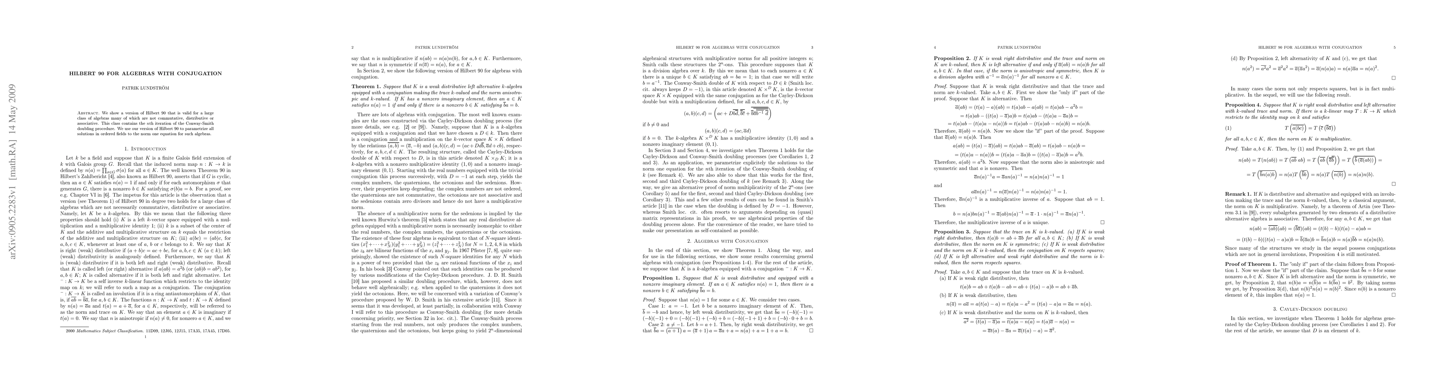 We show a version of Hilbert 90 that is valid for a large class of algebras many of which are not commutative, distributive or associative. This class contains the nth iteration of the Conway-Smith doubling procedure. We use our version of Hilbert 90 to parametrize all solutions in ordered fields to the norm one equation for such algebras.