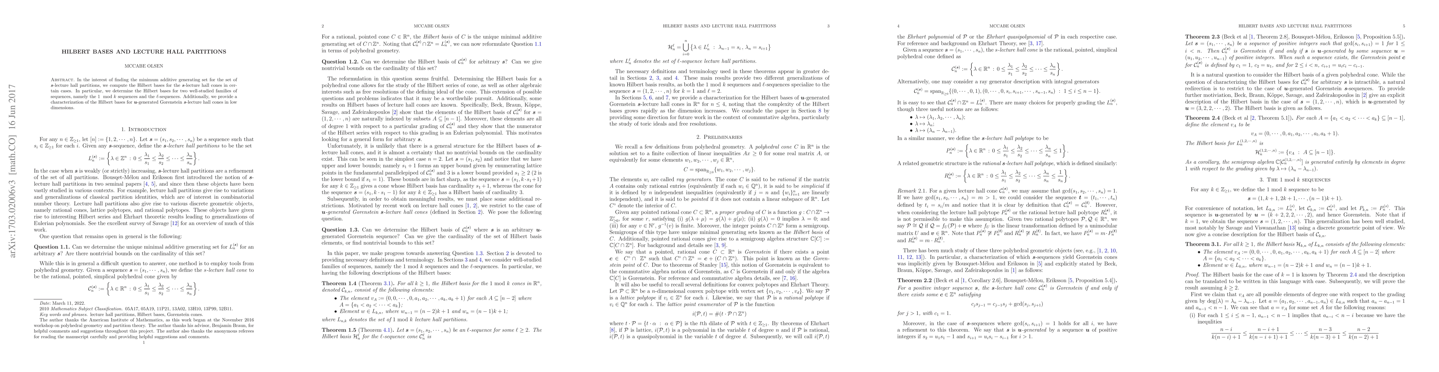 This paper computes Hilbert bases for $\boldsymbol{s}$-lecture hall partitions to determine their minimum additive generating sets, focusing on $1\mod k$ and $\ell$-sequences. It also characterizes the Hilbert bases for $\boldsymbol{u}$-generated Gorenstein $\boldsymbol{s}$-lecture hall cones in low dimensions.