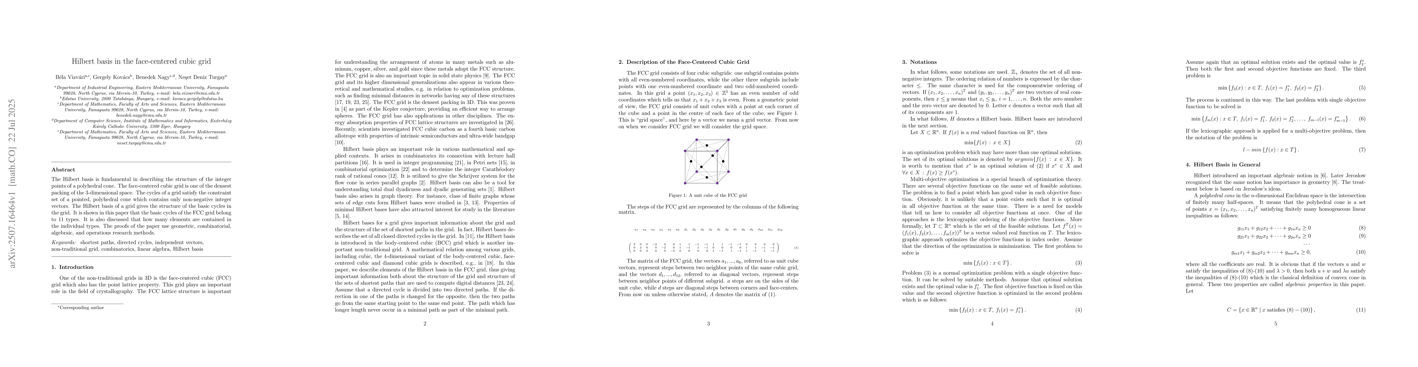 The Hilbert basis is fundamental in describing the structure of the integer points of a polyhedral cone. The face-centered cubic grid is one of the densest packing of the 3-dimensional space. The cycles of a grid satisfy the constraint set of a pointed, polyhedral cone which contains only non-negative integer vectors. The Hilbert basis of a grid gives the structure of the basic cycles in the grid. It is shown in this paper that the basic cycles of the FCC grid belong to 11 types. It is also discussed that how many elements are contained in the individual types. The proofs of the paper use geometric, combinatorial, algebraic, and operations research methods.
