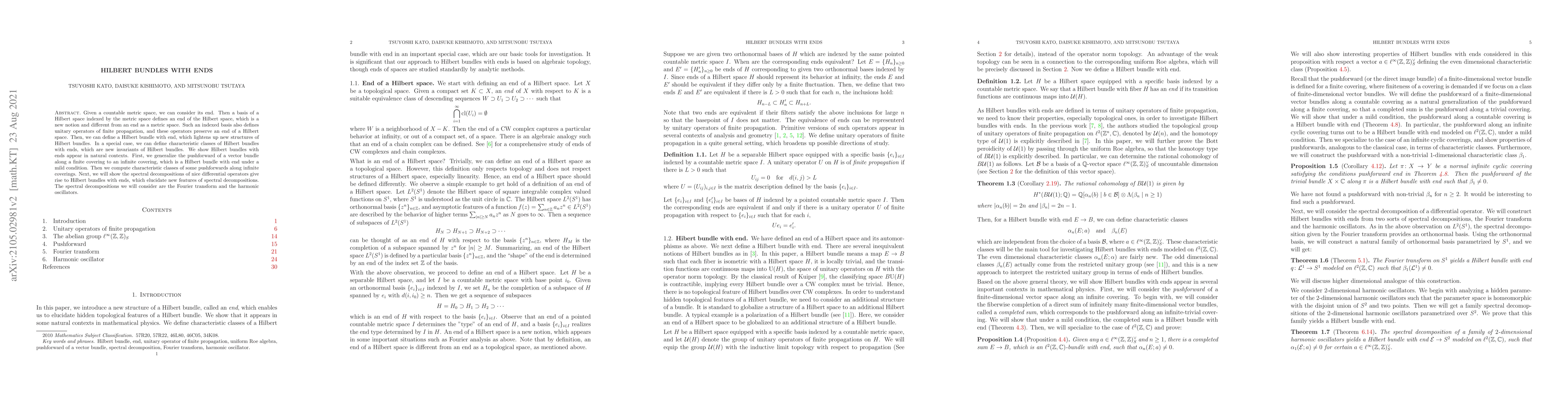 This paper introduces the concept of Hilbert bundles with ends, defined by a countable metric space basis, and explores their unitary operators and characteristic classes. It demonstrates their natural occurrence in contexts like infinite pushforwards and spectral decompositions, such as the Fourier transform and harmonic oscillators.