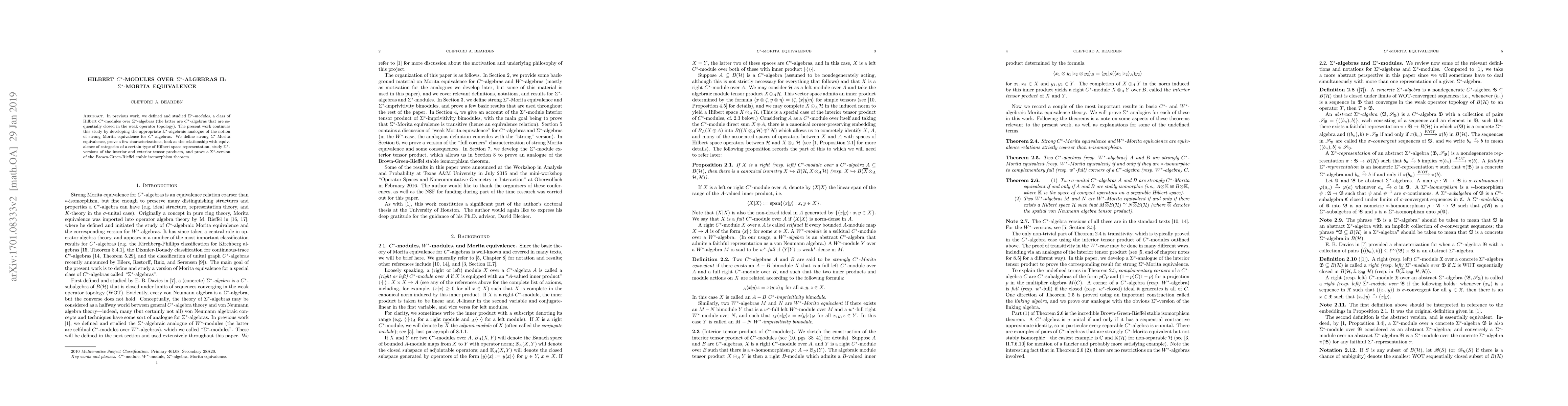 This paper builds on previous work by defining and analyzing $\Sigma^*$-Morita equivalence for $\Sigma^*$-algebras, a class of Hilbert $C^*$-modules. It characterizes this equivalence, explores its connections to Hilbert space representation categories, and proves a $\Sigma^*$-version of the Brown-Green-Rieffel stable isomorphism theorem.