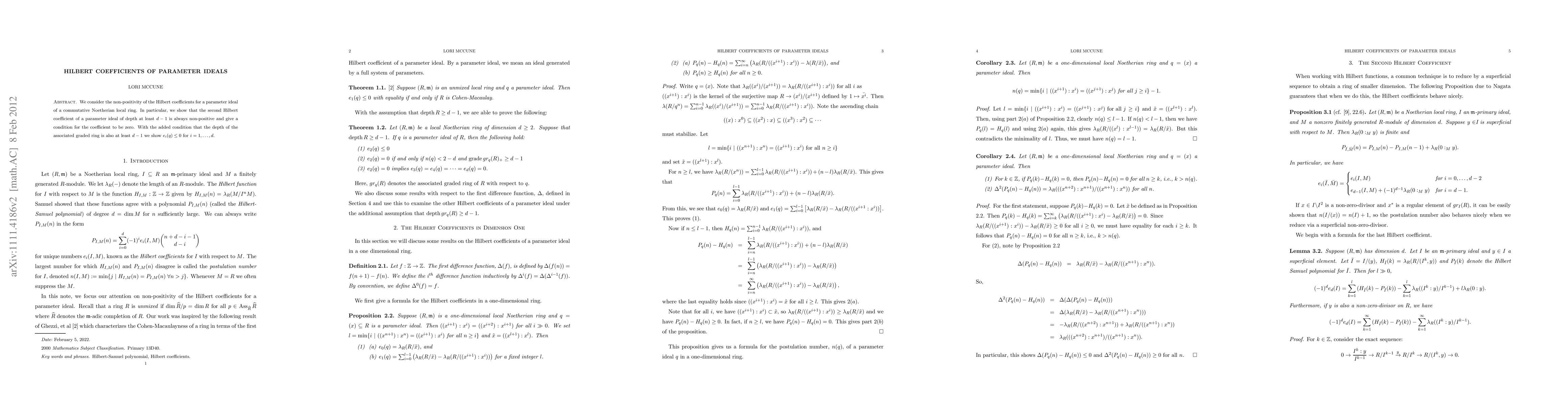 This paper investigates the non-positivity of Hilbert coefficients for parameter ideals in commutative Noetherian local rings, with key findings including a condition for zero coefficients and implications for the associated graded ring.
