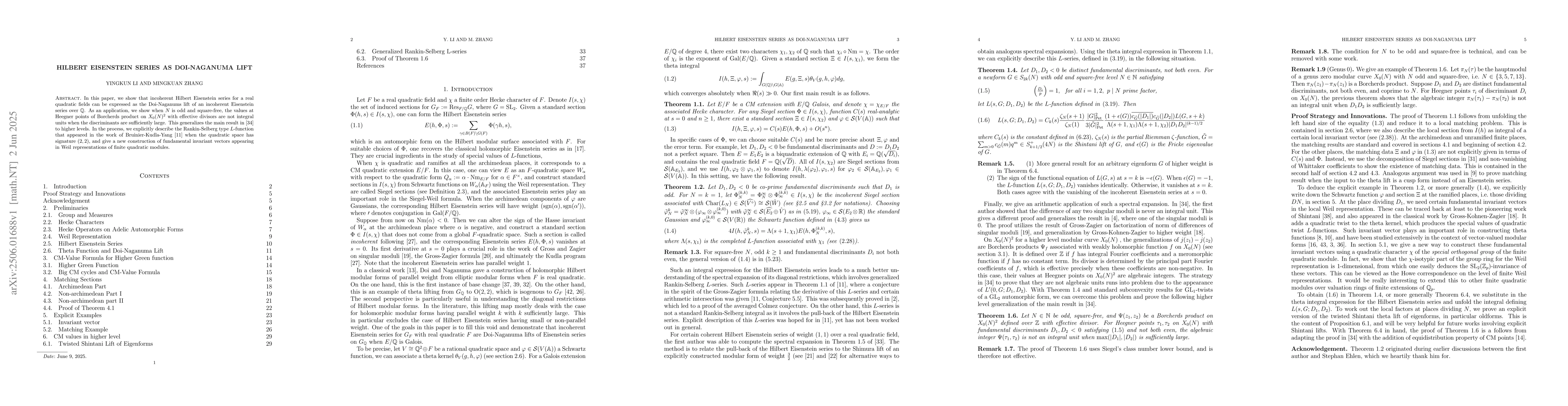 In this paper, we show that incoherent Hilbert Eisenstein series for a real quadratic fields can be expressed as the Doi-Naganums lift of an incoherent Eisenstein series over $\mathbb{Q}$. As an application, we show when $N$ is odd and square-free, the values at Heegner points of Borcherds product on $X_0(N)^2$ with effective divisors are not integral units when the discriminants are sufficiently large. This generalizes a result of the first author to higher levels. In the process, we explicitly describe the Rankin-Selberg type L-function that appeared in the work of Bruinier-Kudla-Yang when the quadratic space has signature (2, 2), and give a new construction of fundamental invariant vectors appearing in Weil representations of finite quadratic modules.