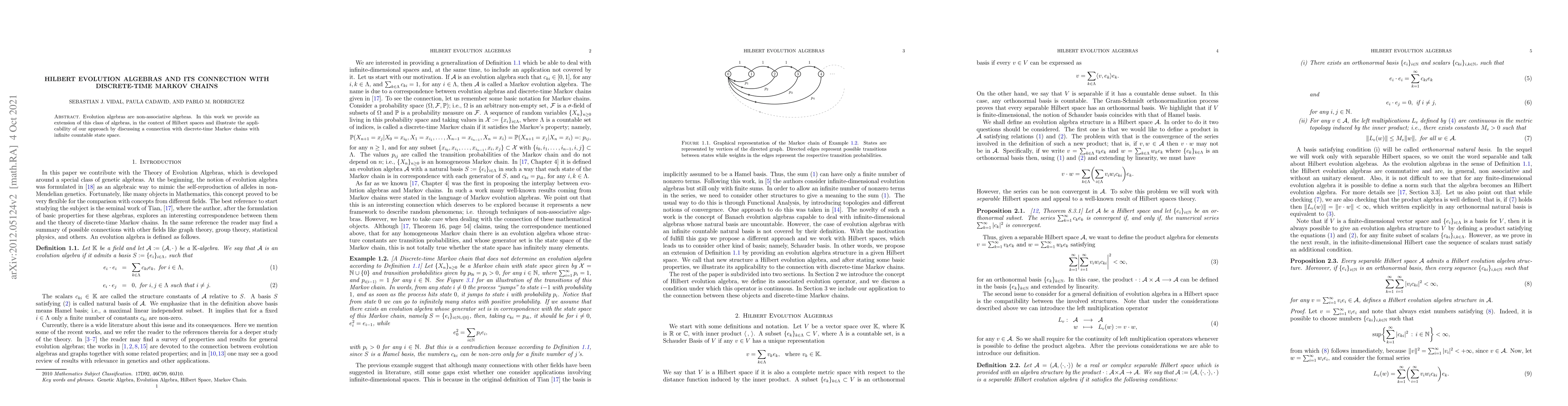 Evolution algebras are non-associative algebras. In this work we provide an extension of this class of algebras, in the context of Hilbert spaces, capable to deal with infinite-dimensional spaces. We illustrate the applicability of our approach by discussing a connection with discrete-time Markov chains with countable state space.