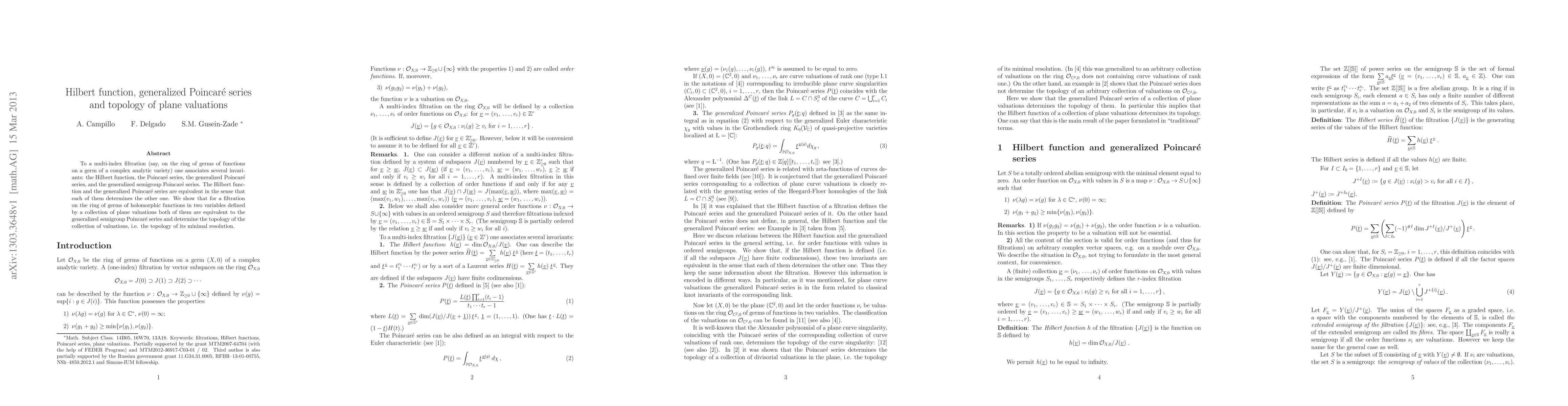 The paper introduces and explores the equivalence between the Hilbert function, generalized Poincaré series, and generalized semigroup Poincaré series for filtrations defined by plane valuations, providing a topological characterization.