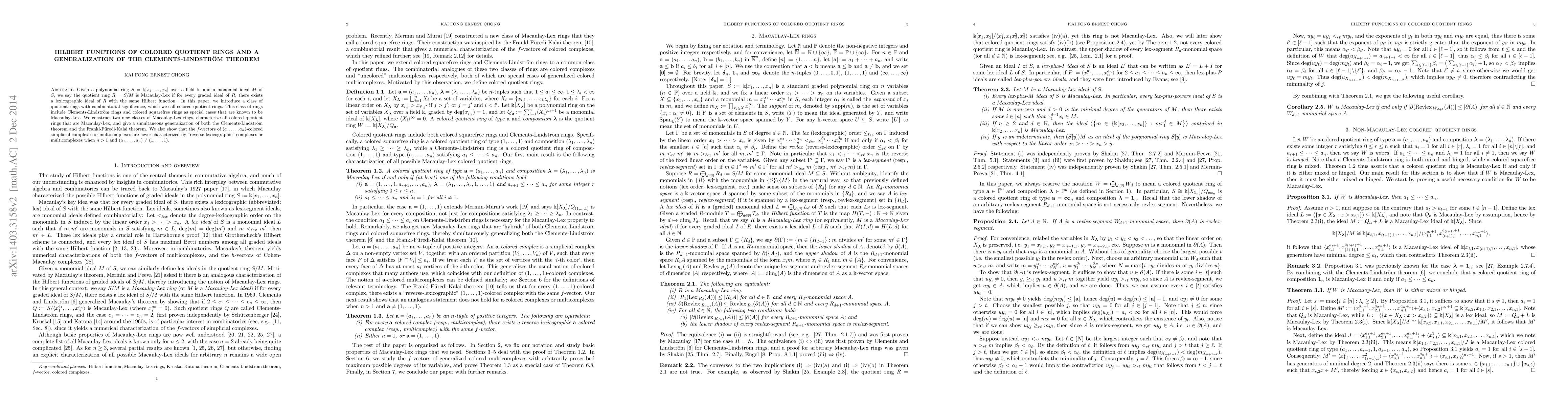 Given a polynomial ring $S = \Bbbk[x_1, \dots, x_n]$ over a field $\Bbbk$, and a monomial ideal $M$ of $S$, we say the quotient ring $R = S/M$ is Macaulay-Lex if for every graded ideal of $R$, there exists a lexicographic ideal of $R$ with the same Hilbert function. In this paper, we introduce a class of quotient rings with combinatorial significance, which we call colored quotient rings. This class of rings include Clements-Lindstr\"om rings and colored squarefree rings as special cases that are known to be Macaulay-Lex. We construct two new classes of Macaulay-Lex rings, characterize all colored quotient rings that are Macaulay-Lex, and give a simultaneous generalization of both the Clements-Lindstr\"om theorem and the Frankl-F\"uredi-Kalai theorem. We also show that the $f$-vectors of $(a_1, \dots, a_n)$-colored simplicial complexes or multicomplexes are never characterized by "reverse-lexicographic" complexes or multicomplexes when $n>1$ and $(a_1, \dots, a_n) \neq (1, \dots, 1)$.