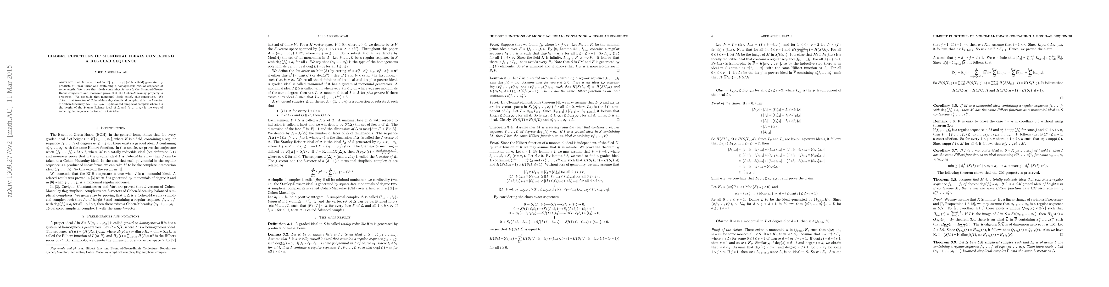 Let $M$ be an ideal in $K[x_1,...,x_n]$ ($K$ is a field) generated by products of linear forms and containing a homogeneous regular sequence of some length. We prove that ideals containing $M$ satisfy the Eisenbud-Green-Harris conjecture and moreover prove that the Cohen-Macaulay property is preserved. We conclude that monomial ideals satisfy this conjecture. We obtain that $h$-vector of Cohen-Macaulay simplicial complex $\Delta$ is the $h$-vector of Cohen-Macaulay $(a_1-1,...,a_t-1)$-balanced simplicial complex where $t$ is the height of the Stanley-Reisner ideal of $\Delta$ and $(a_1,...,a_t)$ is the type of some regular sequence contained in this ideal.