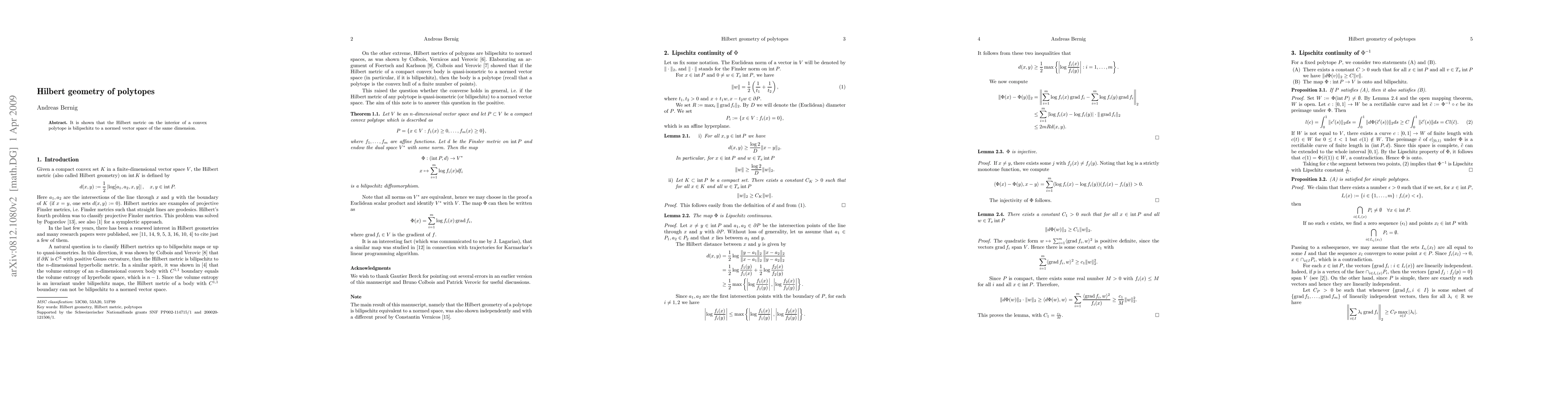 Summary: The paper demonstrates that the Hilbert metric within a convex polytope is bilipschitz equivalent to a normed vector space of the same dimension, establishing a geometric relationship between the two.