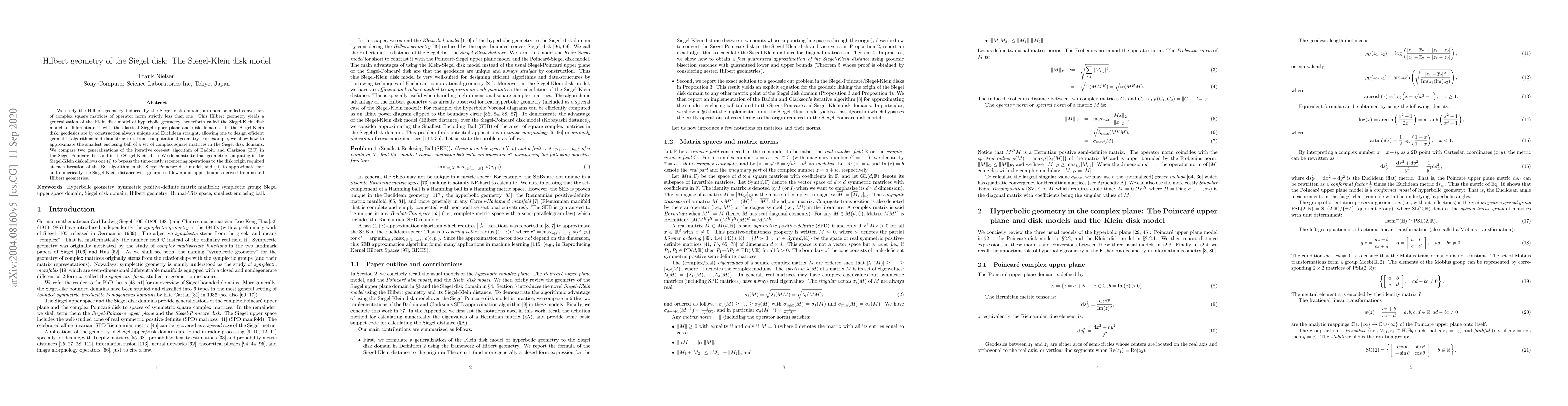 This paper explores the Hilbert geometry of the Siegel disk, introducing the Siegel-Klein disk model as a generalization of the Klein disk model. It demonstrates that this model allows for efficient geometric algorithms, particularly in approximating the smallest enclosing ball for complex square matrices, by bypassing costly recentering operations and providing fast numerical approximations.