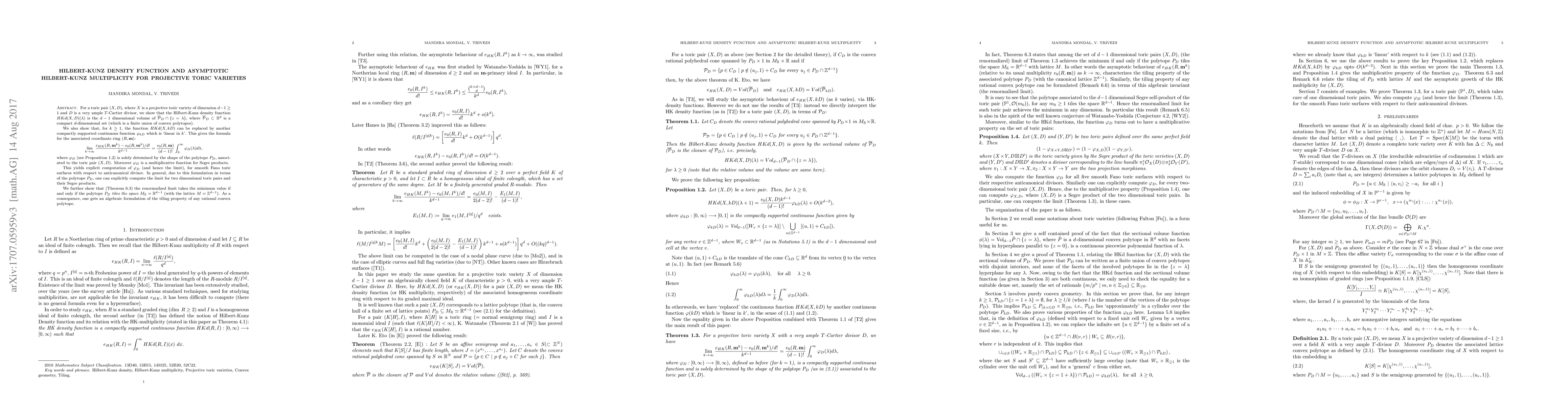 For a toric pair $(X, D)$, where $X$ is a projective toric variety of dimension $d-1\geq 1$ and $D$ is a very ample $T$-Cartier divisor, we show that the Hilbert-Kunz density function $HKd(X, D)(\lambda)$ is the $d-1$ dimensional volume of ${\overline {\mathcal P}}_D \cap \{z= \lambda\}$, where ${\overline {\mathcal P}}_D\subset {\mathbb R}^d$ is a compact $d$-dimensional set (which is a finite union of convex polytopes). We also show that, for $k\geq 1$, the function $HKd(X, kD)$ can be replaced by another compactly supported continuous function $\varphi_{kD}$ which is `linear in $k$'. This gives the formula for the associated coordinate ring $(R, {\bf m})$: $$\lim_{k\to \infty}\frac{e_{HK}(R, {\bf m}^k) - e_0(R, {\bf m}^k)/d!}{k^{d-1}} = \frac{e_0(R, {\bf m})}{(d-1)!}\int_0^\infty\varphi_D(\lambda)d\lambda, $$ where $\varphi_D$ (see Proposition~1.2) is solely determined by the shape of the polytope $P_D$, associated to the toric pair $(X, D)$. Moreover $\varphi_D$ is a multiplicative function for Segre products. This yields explicit computation of $\varphi_D$ (and hence the limit), for smooth Fano toric surfaces with respect to anticanonical divisor. In general, due to this formulation in terms of the polytope $P_D$, one can explicitly compute the limit for two dimensional toric pairs and their Segre products. We further show that (Theorem~6.3) the renormailzed limit takes the minimum value if and only if the polytope $P_D$ tiles the space $M_{\mathbb R} = {\mathbb R}^{d-1}$ (with the lattice $M = {\mathbb Z}^{d-1}$). As a consequence, one gets an algebraic formulation of the tiling property of any rational convex polytope.