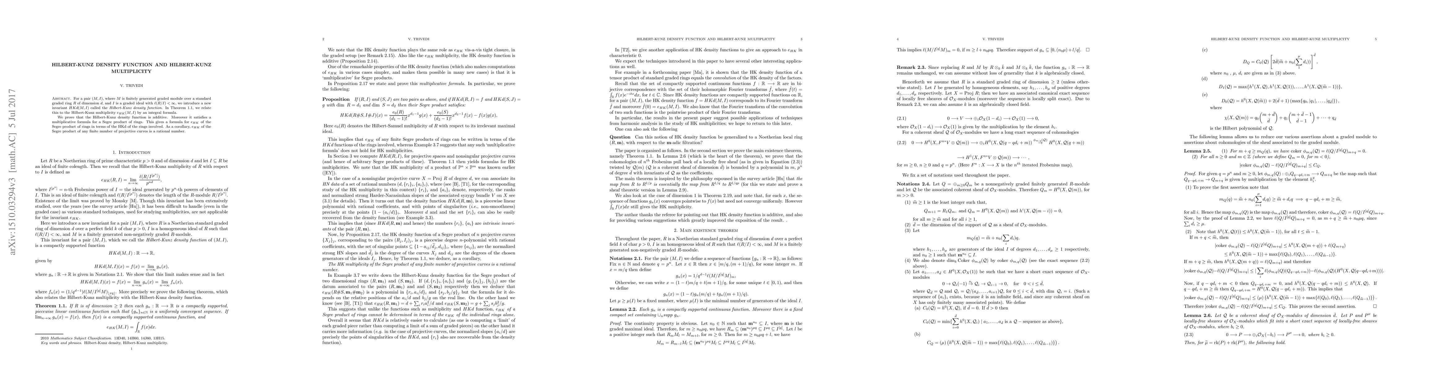The paper introduces the Hilbert-Kunz density function $HKd(M, I)$ and relates it to the Hilbert-Kunz multiplicity $e_{HK}(M,I)$ via an integral formula. It proves the additivity and multiplicative properties of the density function, leading to rational expressions for $e_{HK}$ in Segre products of projective curves and growth rate estimates for $e_{HK}(R, {\bf m}^k)$.