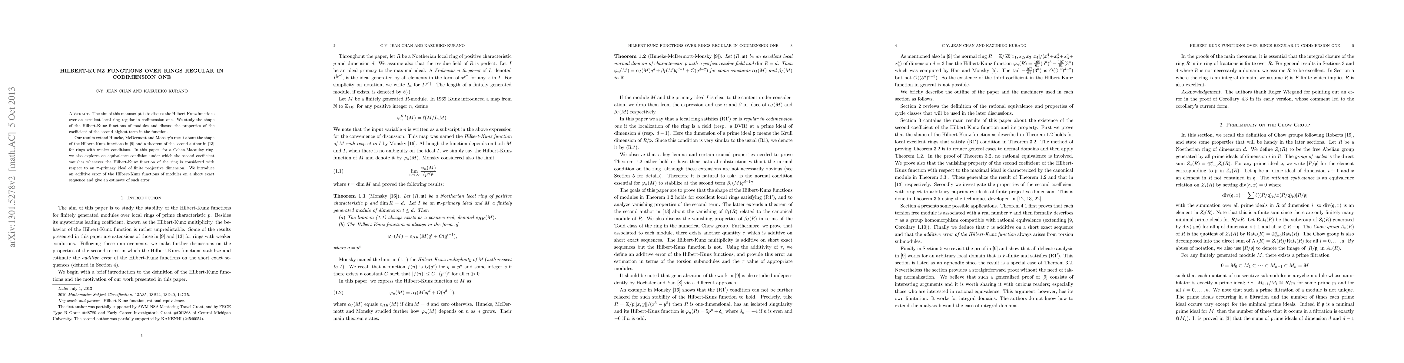The aim of this manuscript is to discuss the Hilbert-Kunz functions over an excellent local ring regular in codimension one. We study the shape of the Hilbert-Kunz functions of modules and discuss the properties of the coefficient of the second highest term in the function. Our results extend Huneke, McDermott and Monsky's result (Math. Res. Lett. 11 (2004), no. 4, 539-546) about the shape of the Hilbert-Kunz functions, and a theorem of the second author (J. Algebra 304 (2006), no. 1, 487-499) for rings with weaker conditions. In this paper, for a Cohen-Macaulay ring, we also explores an equivalence condition under which the second coefficient vanishes whenever the Hilbert-Kunz function of the ring is considered with respect to an ideal primary to the maximal ideal and of finite projective dimension. We introduce an additive error of the Hilbert-Kunz functions of modules on a short exact sequence and give an estimate of such error.