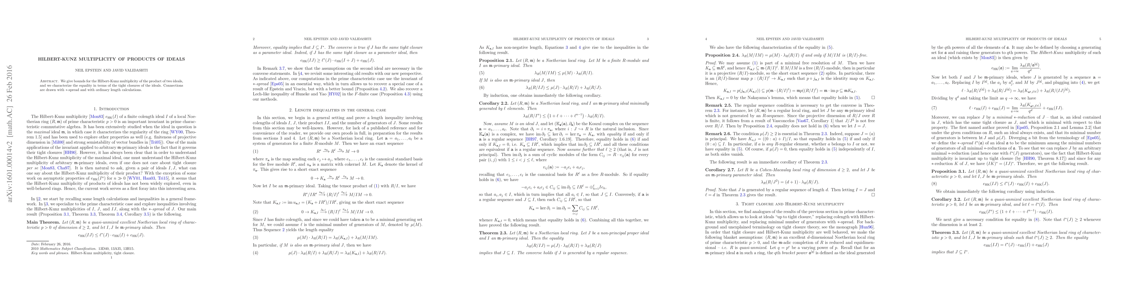 We give bounds for the Hilbert-Kunz multiplicity of the product of two ideals, and we characterize the equality in terms of the tight closures of the ideals. Connections are drawn with $*$-spread and with ordinary length calculations.