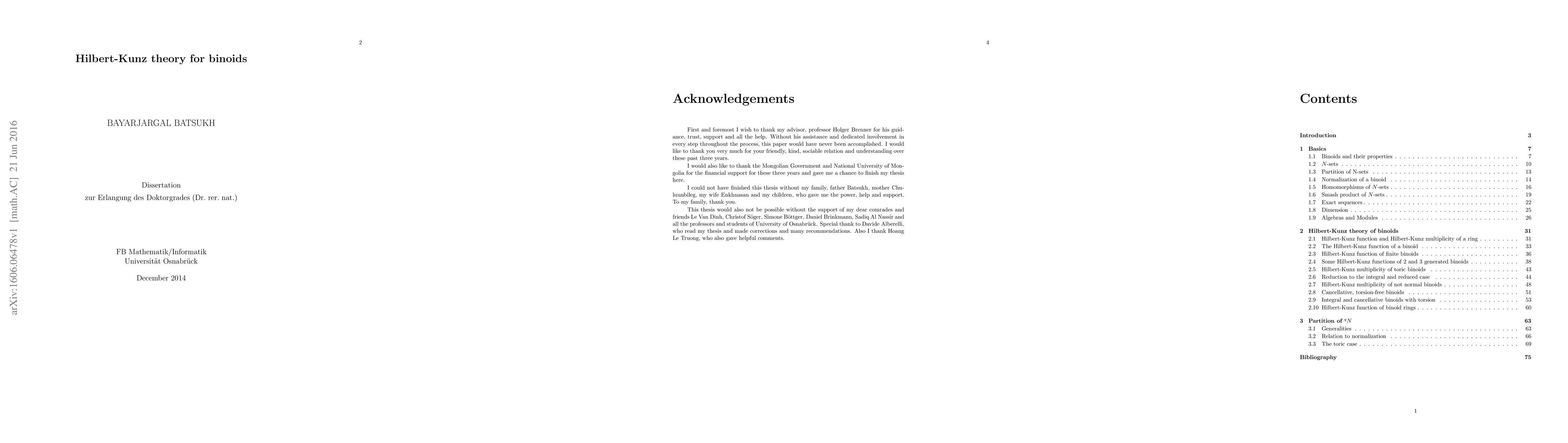 This paper develops Hilbert-Kunz theory for binoids, proving the existence and rationality of the Hilbert-Kunz multiplicity for specific types of binoids, thereby showing that the corresponding multiplicity for binoid algebras is characteristic-independent.