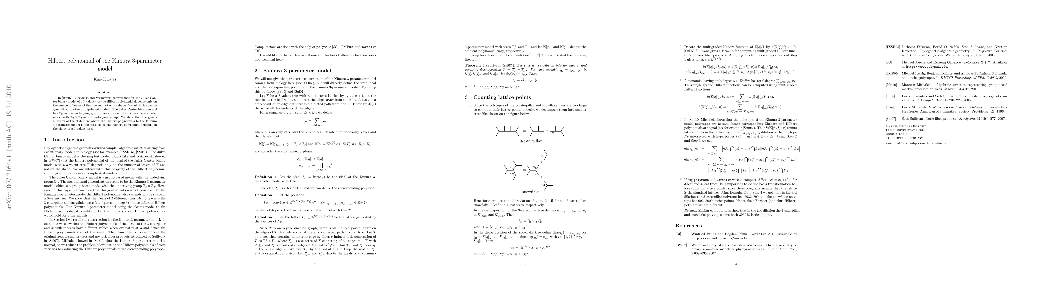 Buczy\'{n}ska and Wi\'{s}niewski showed that for the Jukes Cantor binary model of a 3-valent tree the Hilbert polynomial depends only on the number of leaves of the tree and not on its shape. We ask if this can be generalized to other group-based models. In this paper we consider the Kimura 3-parameter model and show that the generalization of the statement about the Hilbert polynomials to the Kimura 3-parameter model is not possible as the Hilbert polynomial depends on the shape of a 3-valent tree.