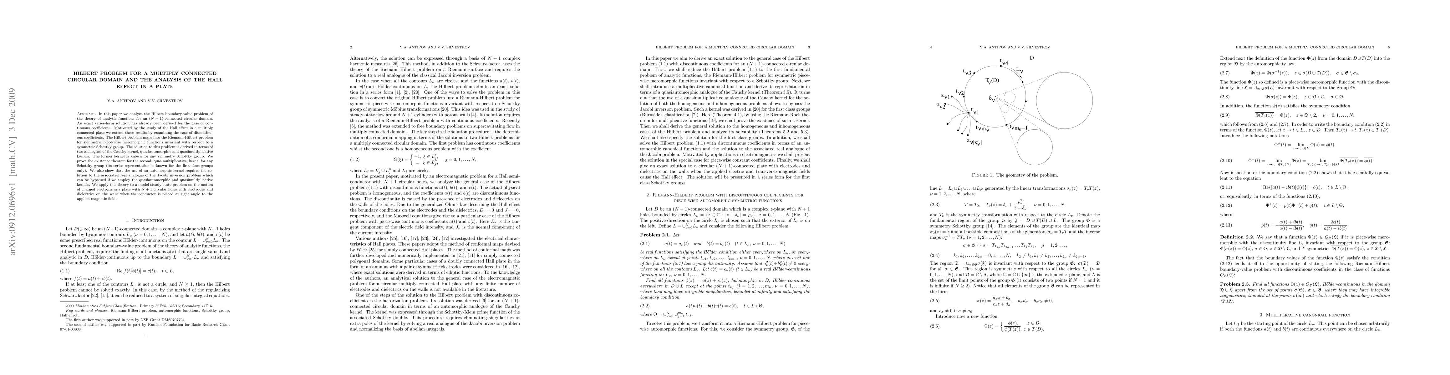 This paper solves the Hilbert boundary-value problem for an $(N+1)$-connected circular domain, extending previous results for continuous coefficients to discontinuous ones. It applies the theory to analyze the Hall effect in a multiply connected plate using quasiautomorphic and quasimultiplicative kernels.
