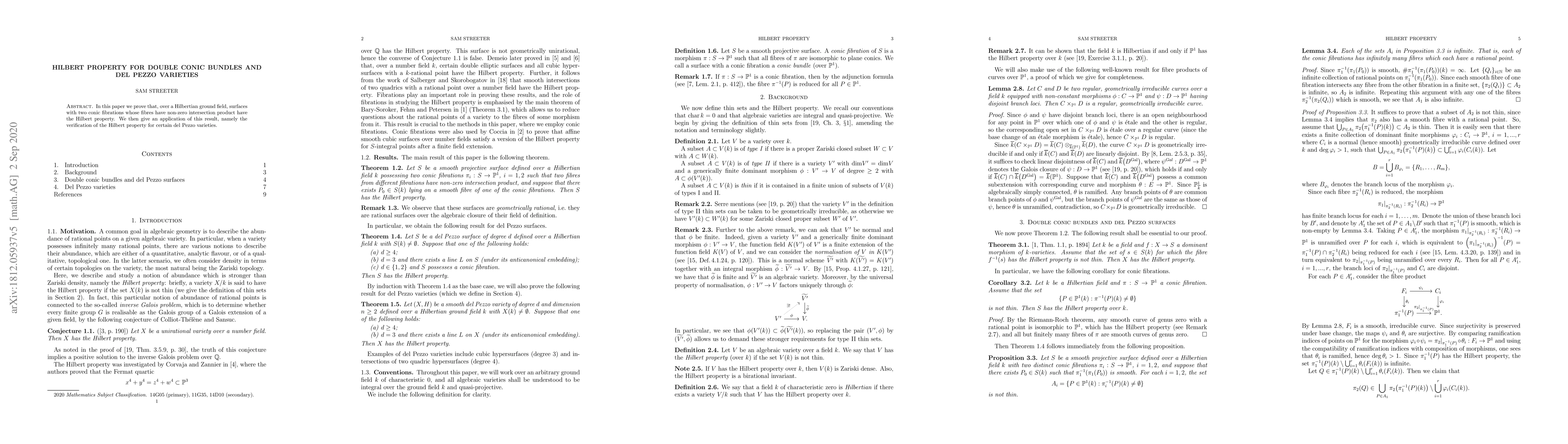 Summary: The paper proves that surfaces with two conic fibrations over a Hilbertian field exhibit the Hilbert property if their fibers have a non-zero intersection product, and applies this to confirm the Hilbert property for specific del Pezzo varieties.