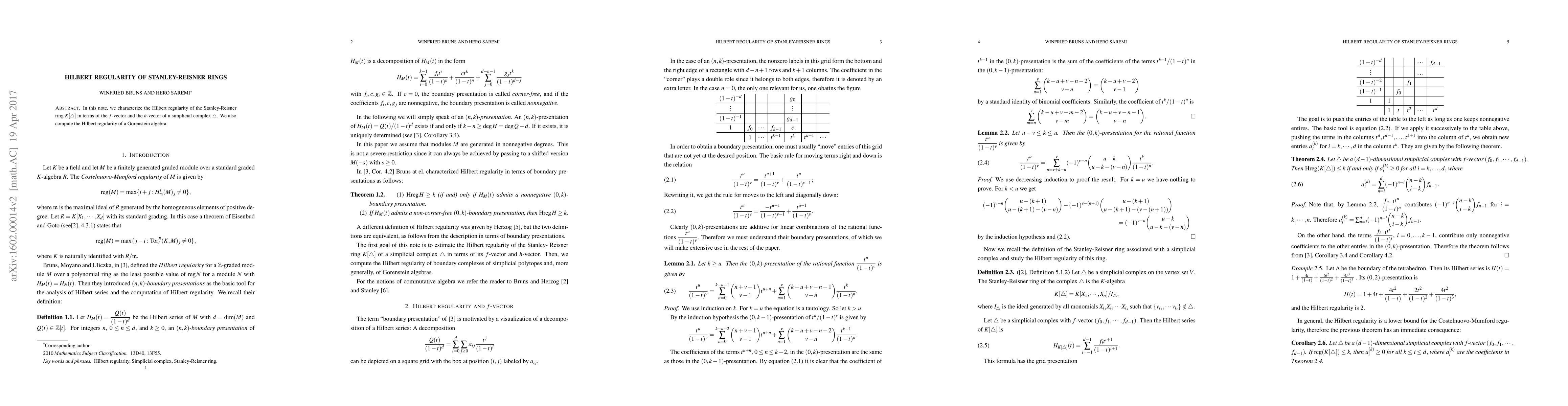 This paper characterizes the Hilbert regularity of Stanley-Reisner rings in terms of their f-vector and h-vector, providing a new understanding of Gorenstein algebras.