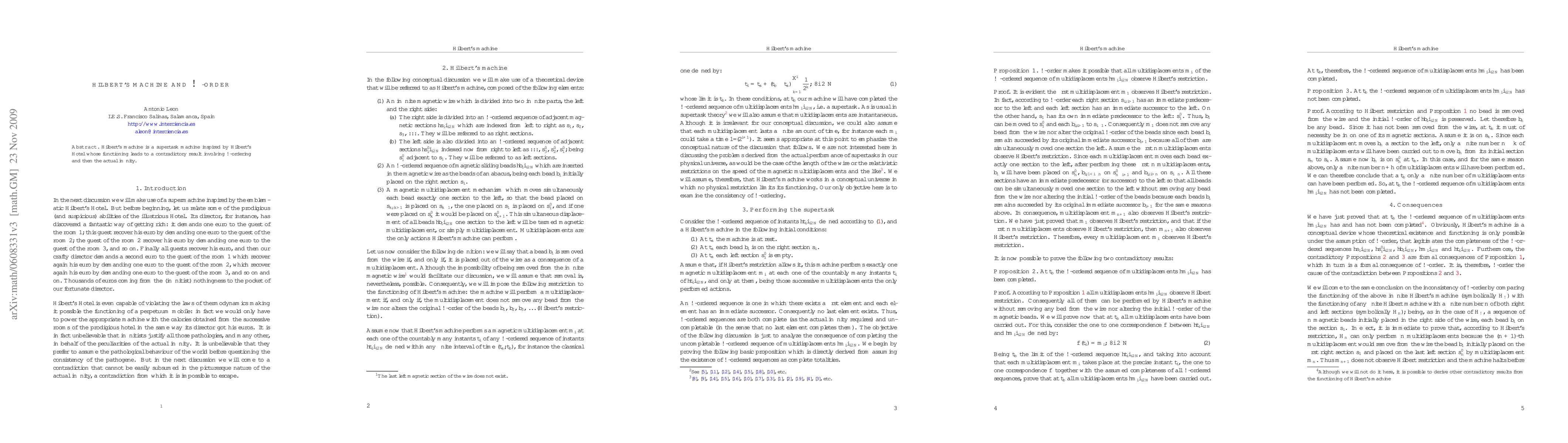 Hilbert's machine is a supertask machine inspired by Hilbert's Hotel whose functioning leads to a contradictory result involving w-ordering.