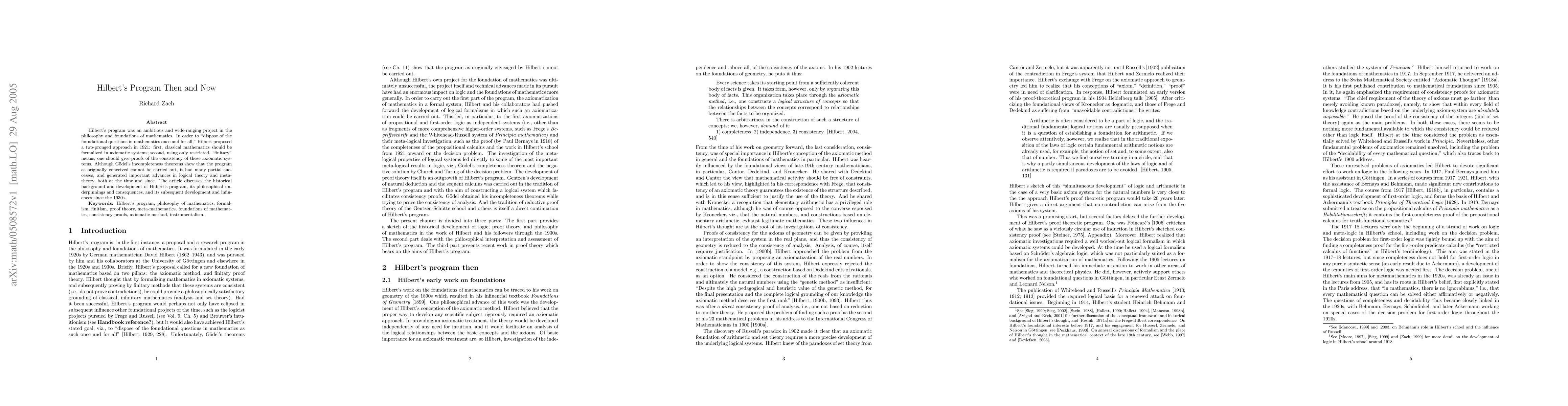 The paper provides a historical context for Hilbert's program, highlighting its philosophical underpinnings and consequences, and discussing its subsequent development and influences since the 1930s.