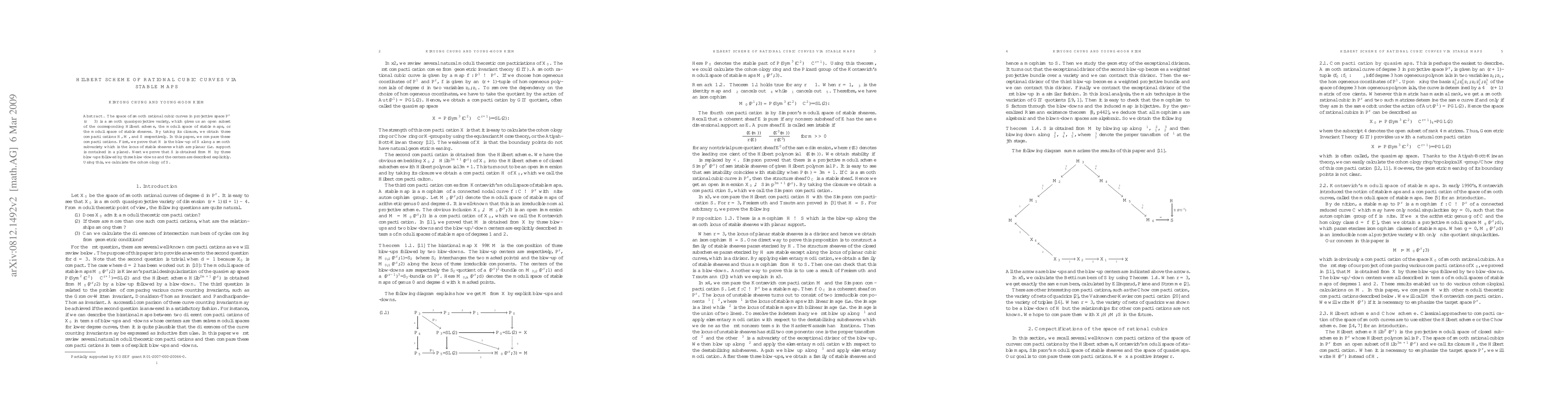 This paper compares three compactifications of the space of smooth rational cubic curves: $\bH$, $\bM$, and $\bS$. It shows $\bH$ is a blow-up of $\bS$ along a locus of planar stable sheaves, and $\bS$ is derived from $\bM$ through specific blow-ups and blow-downs, enabling the calculation of $\bS$'s cohomology.