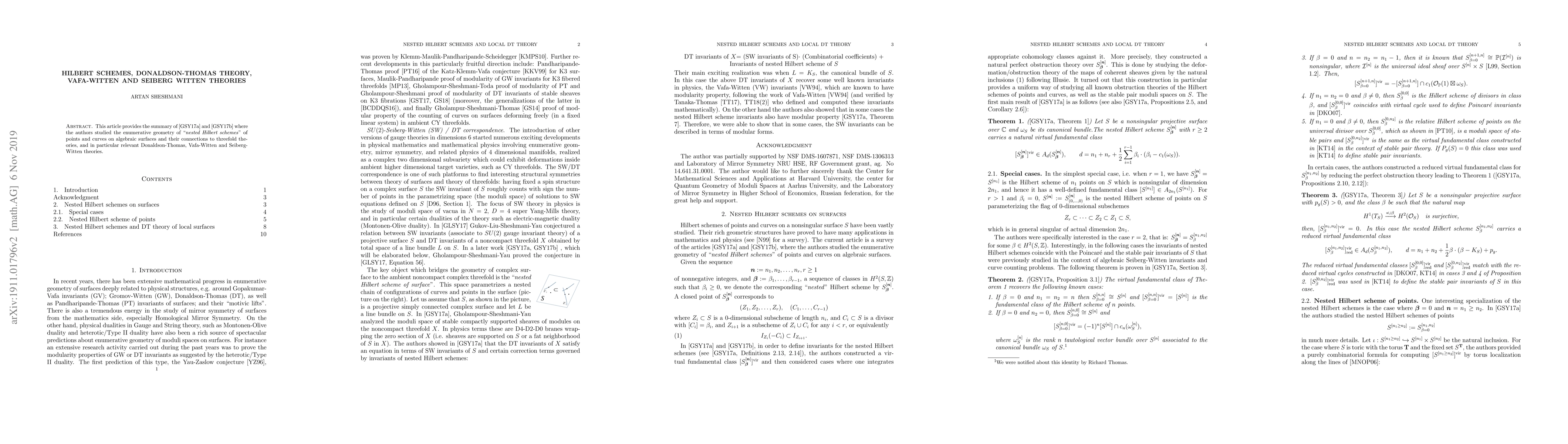 This article provides a summary of arXiv:1701.08899 and arXiv:1701.08902 where the authors studied the enumerative geometry of nested Hilbert schemes of points and curves on algebraic surfaces and their connections to threefold theories, and in particular relevant Donaldson-Thomas, Vafa-Witten and Seiberg-Witten theories.