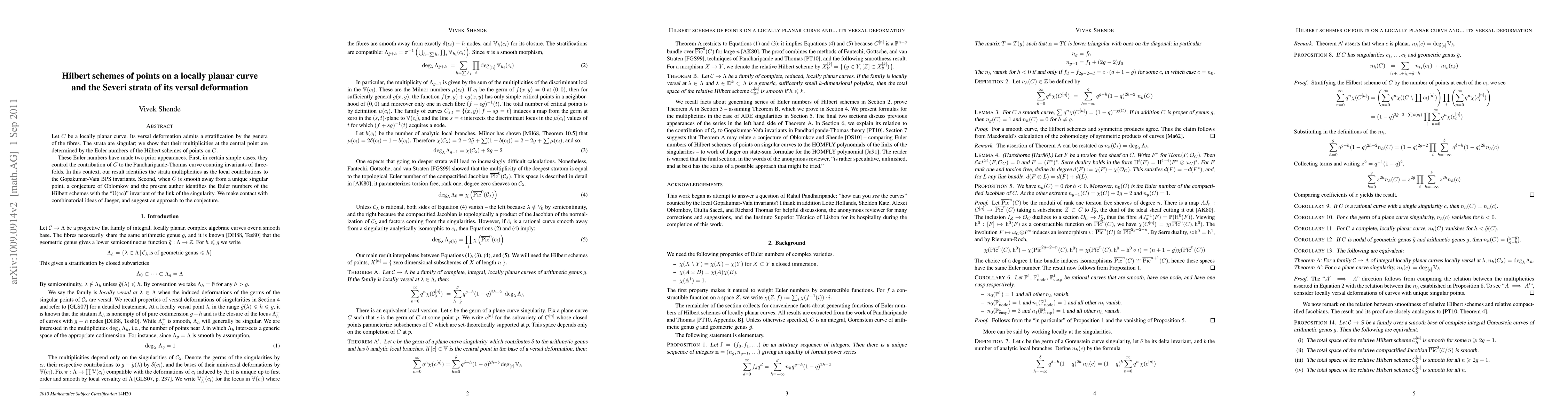 This research investigates the stratification of versal deformations of locally planar curves by their genera, demonstrating that multiplicities of these strata are determined by Euler numbers of Hilbert schemes of points on the curve. The findings connect these Euler numbers to contributions in Pandharipande-Thomas invariants and a conjecture linking them to the "U(infinity)" invariant of singularity links, with suggested combinatorial approaches.