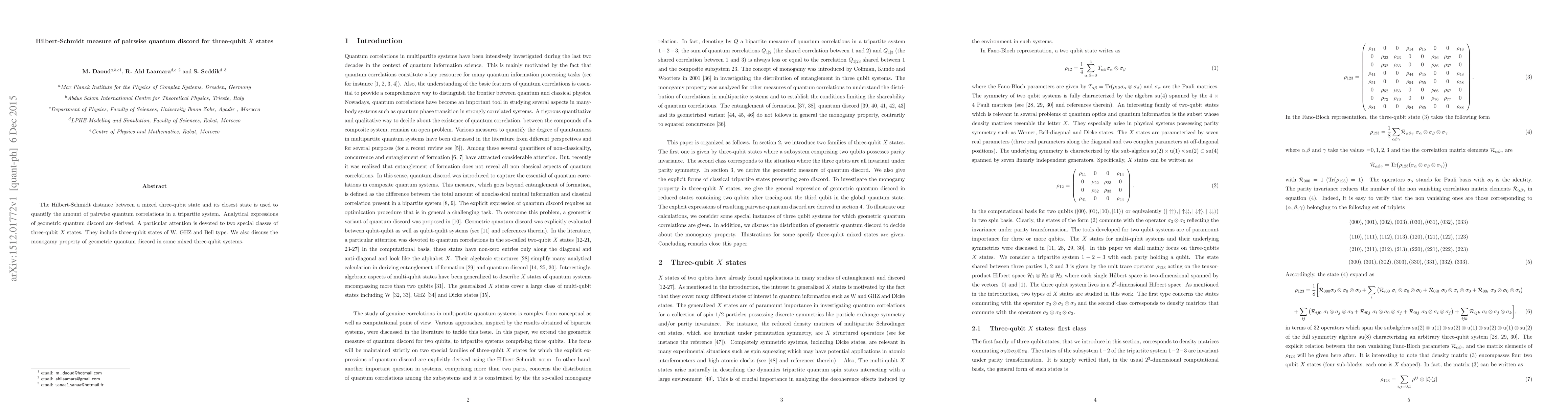 The Hilbert-Schmidt distance between a mixed three-qubit state and its closest state is used to quantify the amount of pairwise quantum correlations in a tripartite system. Analytical expressions of geometric quantum discord are derived. A particular attention is devoted to two special classes of three-qubit $X$ states. They include three-qubit states of ${\rm W}$, ${\rm GHZ}$ and Bell type. We also discuss the monogamy property of geometric quantum discord in some mixed three-qubit systems.