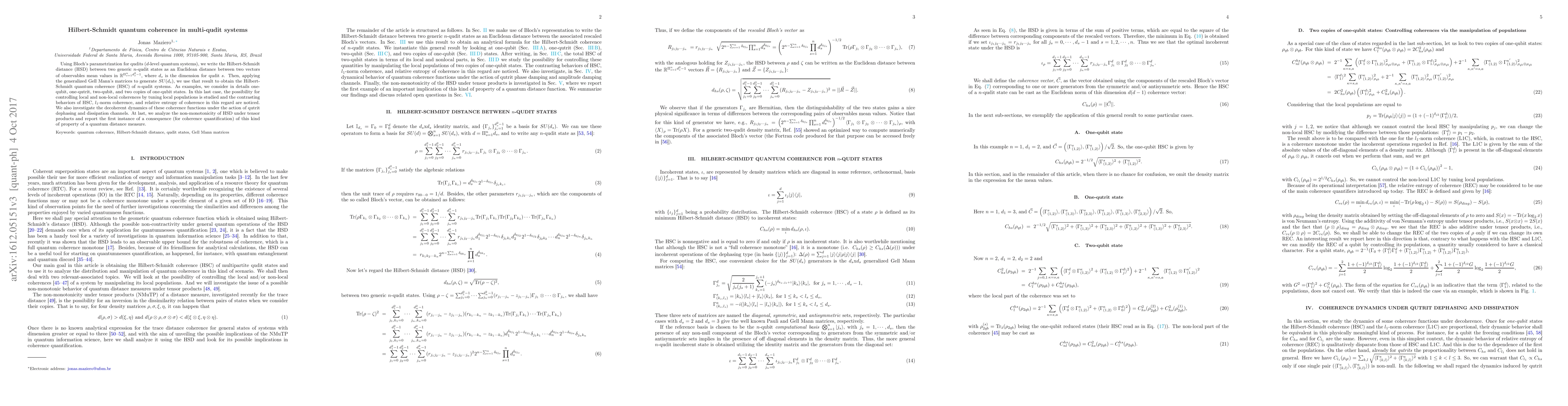 The paper derives a closed-form expression for the Hilbert-Schmidt distance (HSD) between two generic n-qudit states using Bloch's parametrization and generalized Gell-Mann matrices, leading to the Hilbert-Schmidt quantum coherence (HSC) for n-qudit systems.