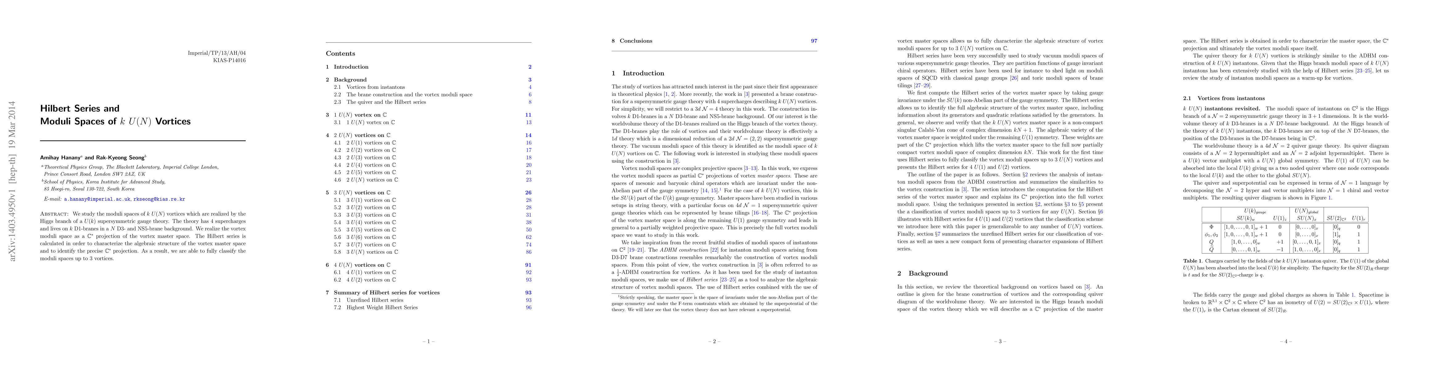 This paper investigates the moduli spaces of k U(N) vortices in supersymmetric gauge theory on D1-branes, utilizing the Hilbert series to characterize the algebraic structure of the vortex master space. It fully classifies these moduli spaces for configurations with up to 3 vortices.