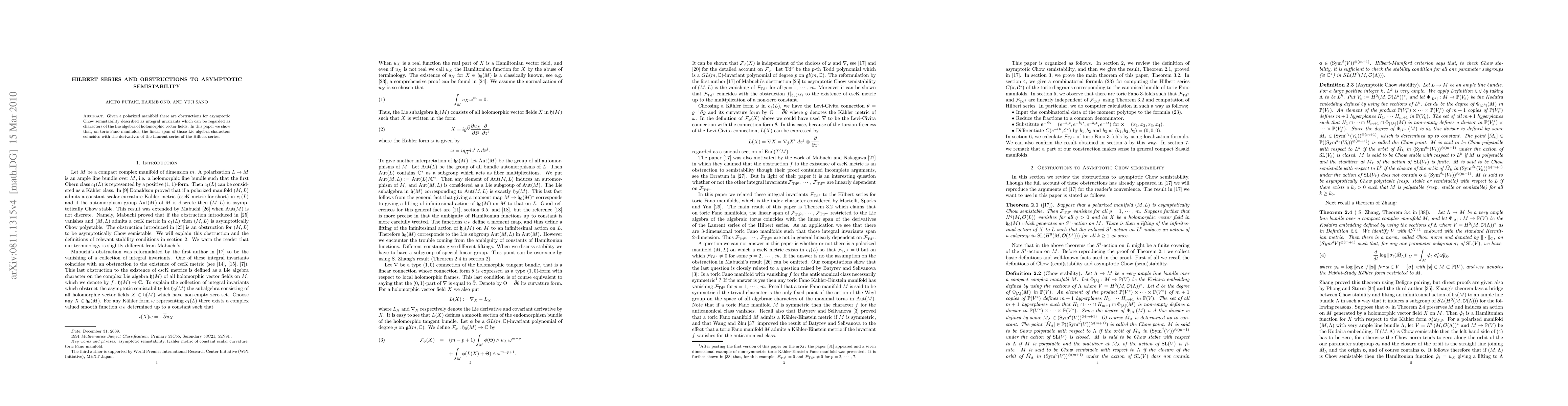 This paper explores the obstructions to asymptotic Chow semistability in polarized manifolds, particularly focusing on the independence of these obstructions. It demonstrates through toric Fano threefolds that not all obstructions are dependent on the absence of constant scalar curvature Kähler metrics, revealing that they span at least two dimensions and are derived from the Hilbert series.