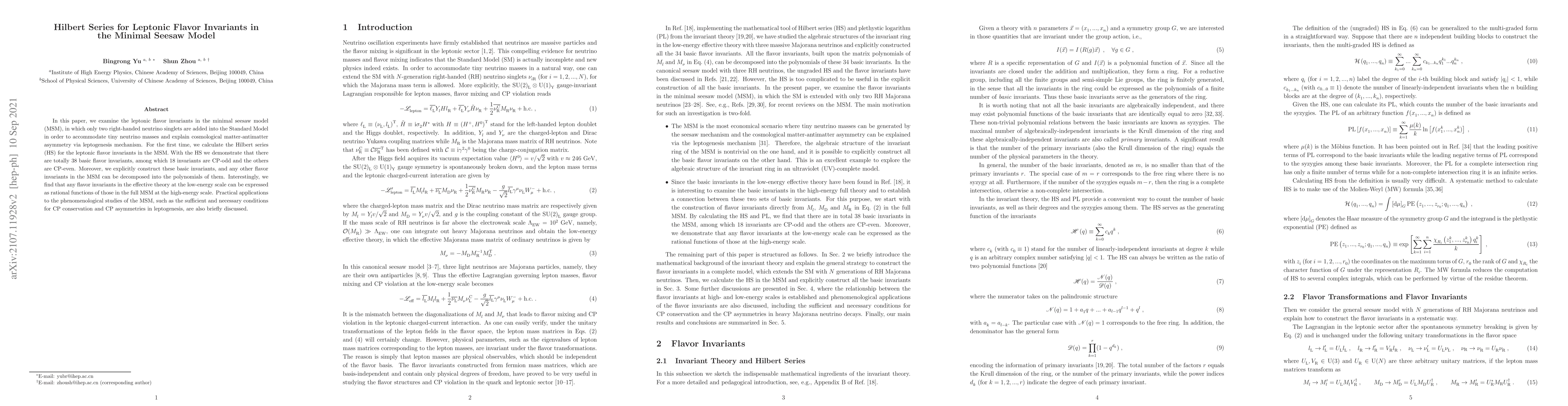This paper calculates the Hilbert series for leptonic flavor invariants in the minimal seesaw model, revealing 38 basic invariants, 18 of which are CP-odd. It also shows how low-energy invariants can be expressed as rational functions of high-energy invariants, with implications for CP conservation and asymmetries in leptogenesis.