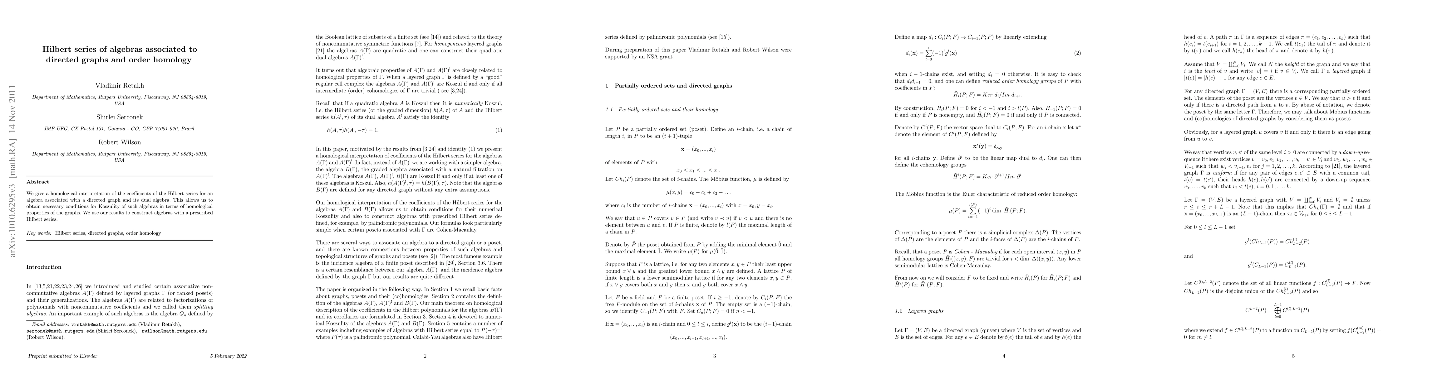 Summary: This paper interprets the coefficients of the Hilbert series for algebras tied to directed graphs, linking these coefficients to Koszulity conditions through graph homological properties and constructing algebras with specific Hilbert series.