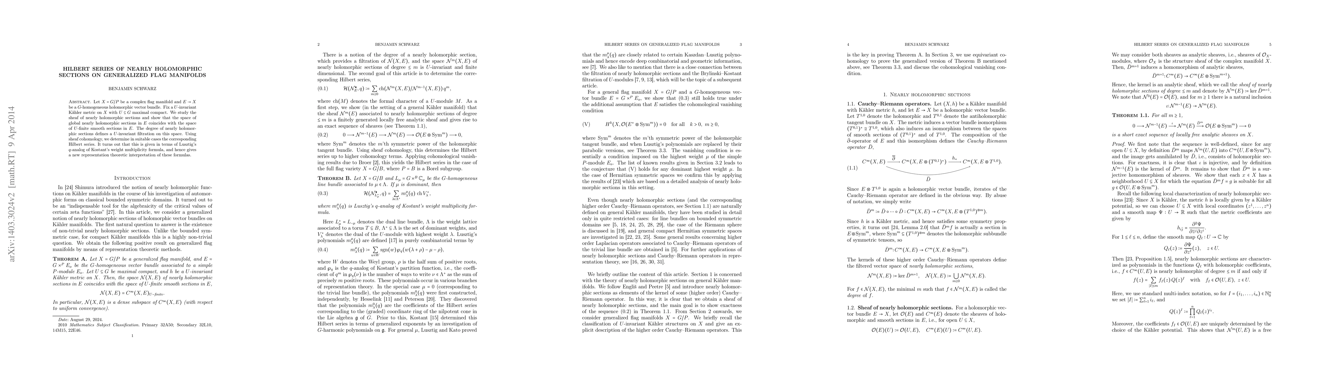 This paper investigates the sheaf of nearly holomorphic sections on complex flag manifolds, demonstrating that the space of global nearly holomorphic sections matches the space of U-finite smooth sections. The authors determine Hilbert series for these sections, revealing a connection to Lusztig's q-analog of Kostant's weight multiplicity formula.