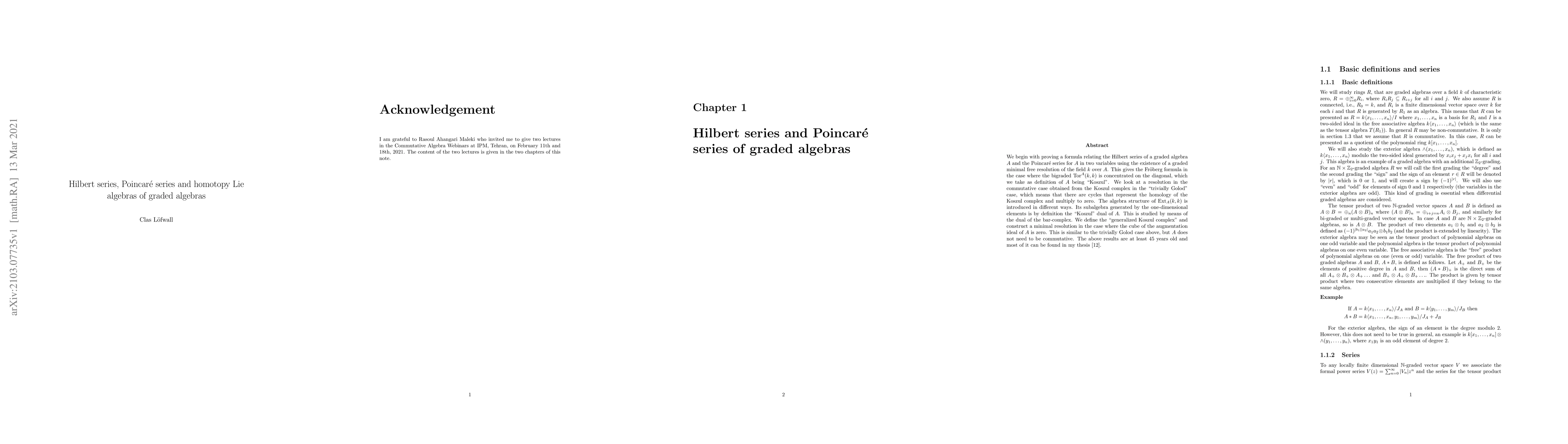 We begin with proving a formula relating the Hilbert series of a graded algebra $A$ and the Poincar\'{e} series for $A$ in two variables. This gives the Fr\"oberg formula in the case where the bigraded $Tor^A(k,k)$ is concentrated on the diagonal, which we take as definition of $A$ being "Koszul". We look at a resolution in the commutative case obtained from the Koszul complex in the "trivially Golod" case. The algebra structure of $Ext_A(k,k)$ is introduced in different ways. Its subalgebra generated by the one-dimensional elements is by definition the "Koszul" dual of $A$. We define the"generalized Koszul complex" and construct a minimal resolution in the case where the cube of the augmentation ideal of $A$ is zero. The above results are at least 45 years old and most of it can be found in my thesis. In the second part graded Lie algebras are defined. Free Lie algebras and enveloping algebras are introduced. The Koszul dual is looked upon as the enveloping algebra of a Lie algebra in the graded commutative case with examples. The Poincar\'{e}-Birkhoff-Witt theorem is stated giving a formula for the Hilbert series of the enveloping algebra. The homotopy Lie algebra is defined in different ways, in particular the Lie subalgebra generated by the one-dimensional elements. Examples of homotopy Lie algebras are given for complete intersections, Golod rings and rings with the cube of the augmentation ideal equal to zero. A logarithmic formula for the dimensions of a Lie algebra given the Hilbert series for its enveloping algebra is given. Examples of periodic Lie subalgebras are given, yielding irrational Poincar\'{e} series. The "holonomy" Lie algebra of a hyperplane arrangement is defined examplified by the graphical arrangement $K_4$.