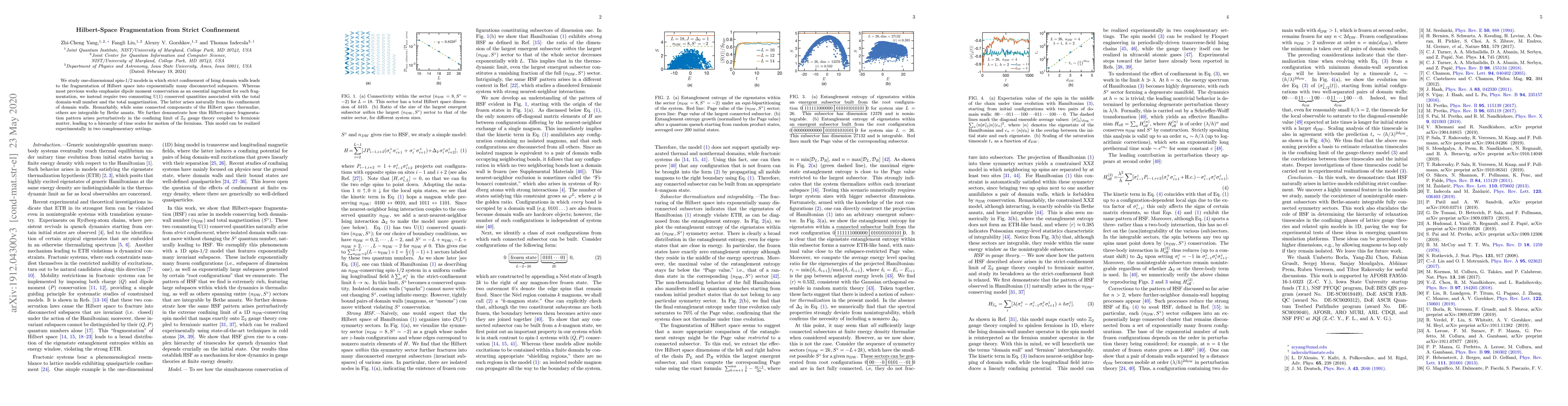 This paper investigates one-dimensional spin-1/2 models where strict confinement of Ising domain walls results in Hilbert space fragmentation into many disconnected subspaces. The study highlights that this fragmentation relies on two commuting U(1) conserved quantities rather than dipole moment conservation, leading to a mix of thermalizing and integrable components.