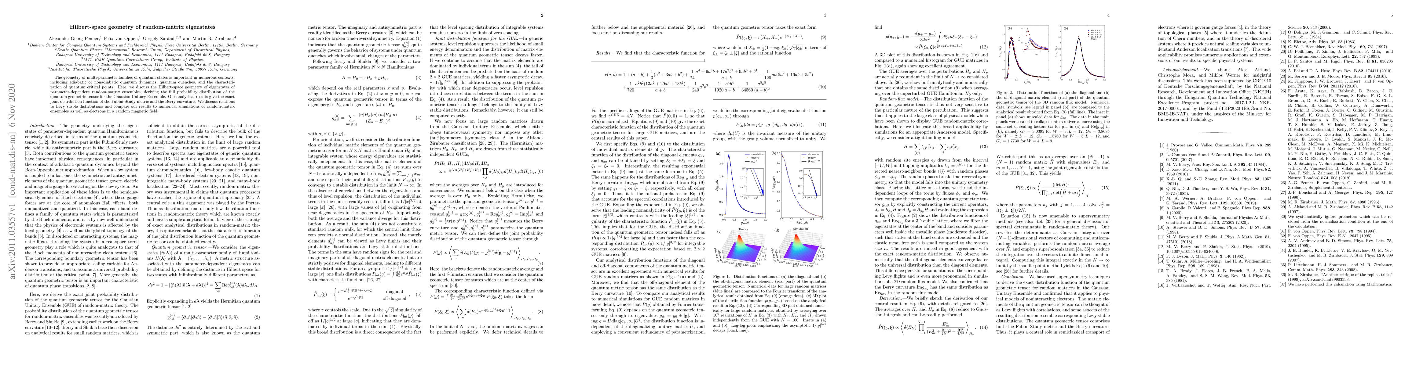 The geometry of multi-parameter families of quantum states is important in numerous contexts, including adiabatic or nonadiabatic quantum dynamics, quantum quenches, and the characterization of quantum critical points. Here, we discuss the Hilbert-space geometry of eigenstates of parameter-dependent random-matrix ensembles, deriving the full probability distribution of the quantum geometric tensor for the Gaussian Unitary Ensemble. Our analytical results give the exact joint distribution function of the Fubini-Study metric and the Berry curvature. We discuss relations to Levy stable distributions and compare our results to numerical simulations of random-matrix ensembles as well as electrons in a random magnetic field.